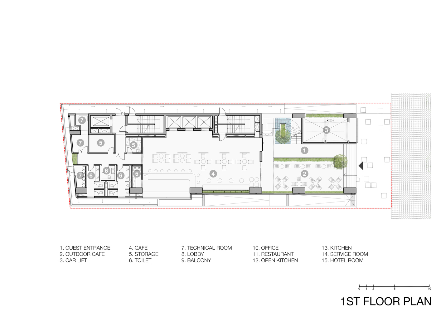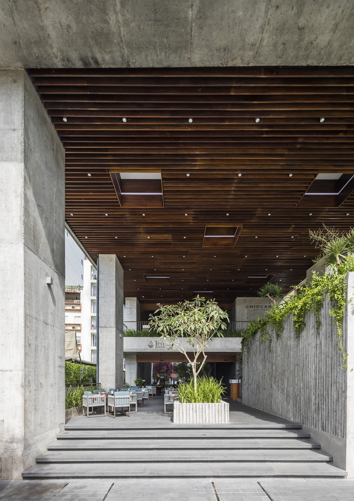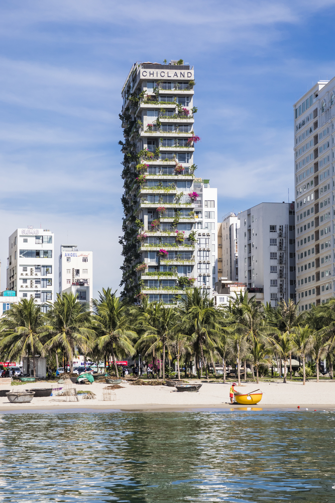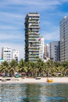 main material is concrete with greenery system covering it, tree pots integrated into balconies, tropical plants are used, materials used in the interior are from natural or local materials, greenery façade creates microclimate for building, making the space cooler.
