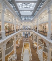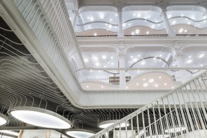 AE Interests: pieces of recent restoration kept visible as an expression of the building’s continuous metamorphosis, organic fluid form, arrangement of lights calculated to fulfill the illumination needs of various products, railing composed of equally spaced metal rods