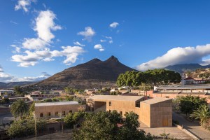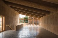 AE Interests: Locally-sourced materials. 30-cm-thick pigmented concrete walls imprinted with wooden boards. Timber and brick details. Passive system due to double-slab sloping roofs, concrete walls, and controlled openings. No air conditioning system.