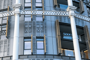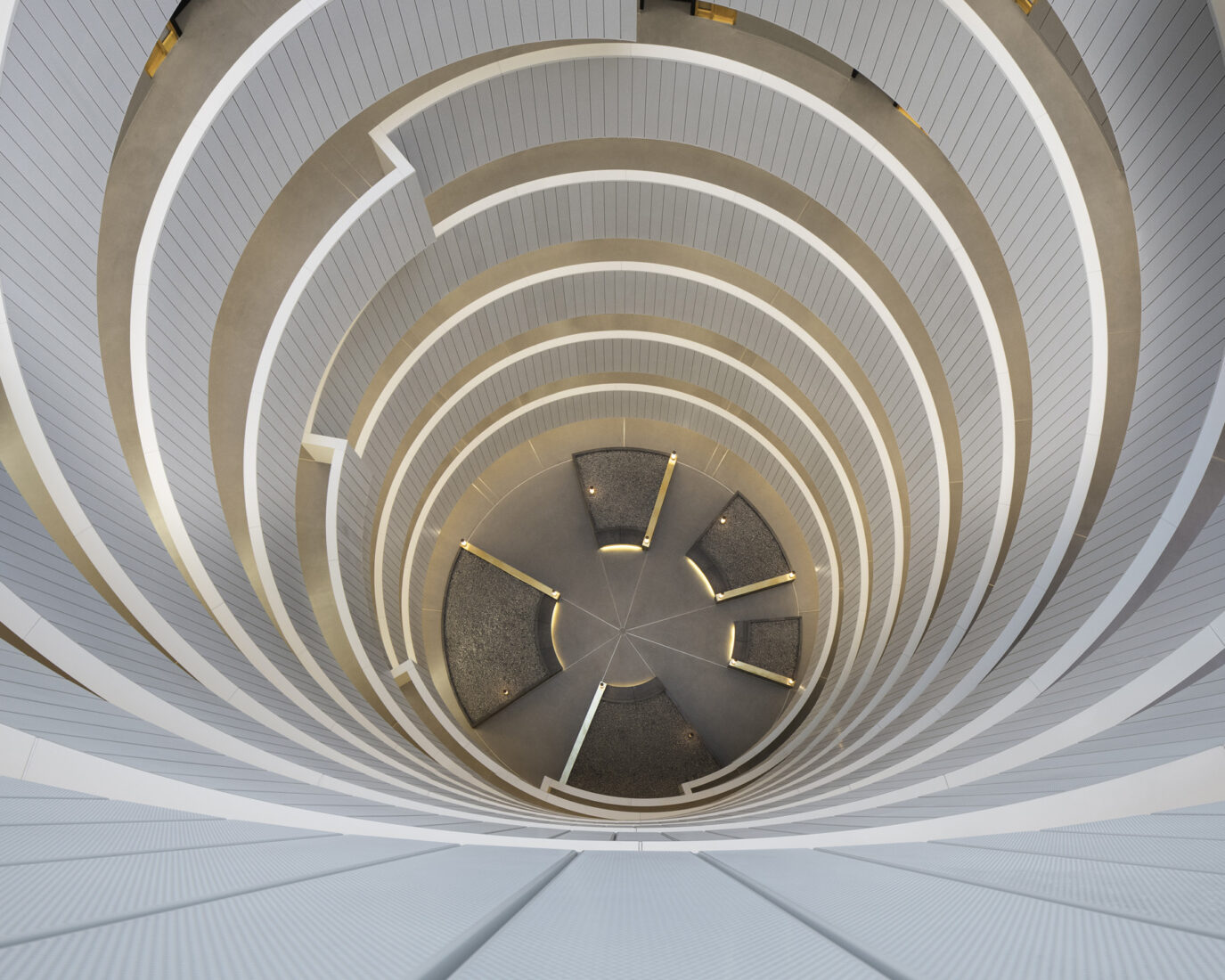 AE Interests: luxury residential apartments, cylindrical volumes, curvilinear design, perforated and motorized shutters, circular atria, repurposing and restoration project, historical preservation, 257,796 ft² and 145 apartments, precast concrete panels