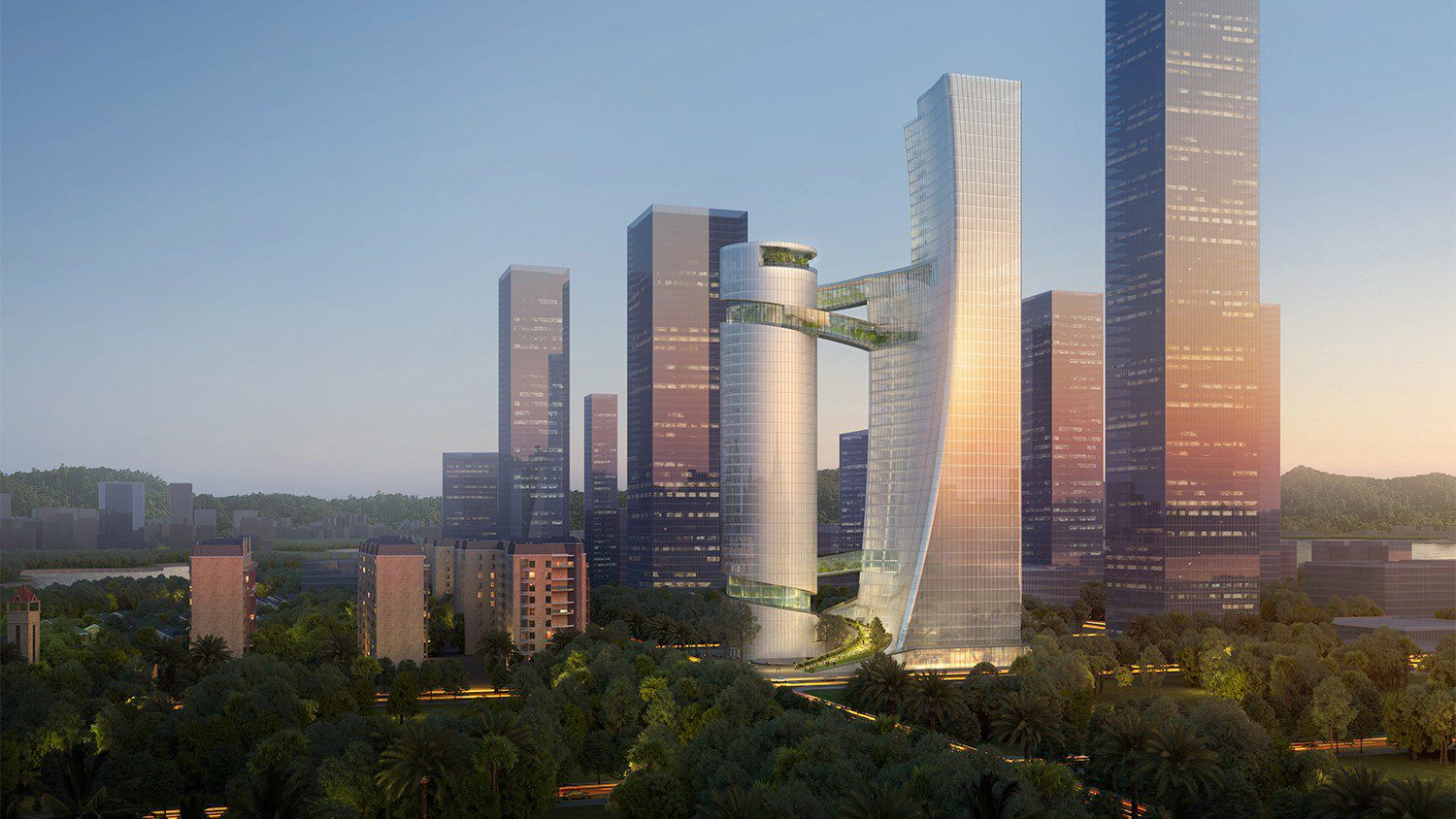 AE Interests: multi-use high rise, garden bridges, curvilinear, glass curtain walls, gray water and recycling system, 150m (492ft) residential tower, 200m (656ft) office tower, suspension bridges