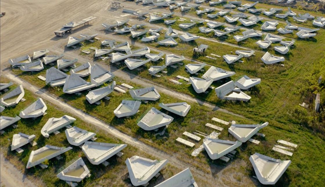 AE Interests: Parametric design fabricated offsite and connected using stainless steel, rebar, and concrete. Park includes two pedestrian bridges, two amphitheaters, vendors, green spaces, and a walking trail with elevation changes. Water drainage scheme through pots. Landscape architecture.