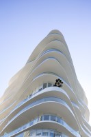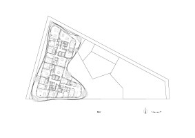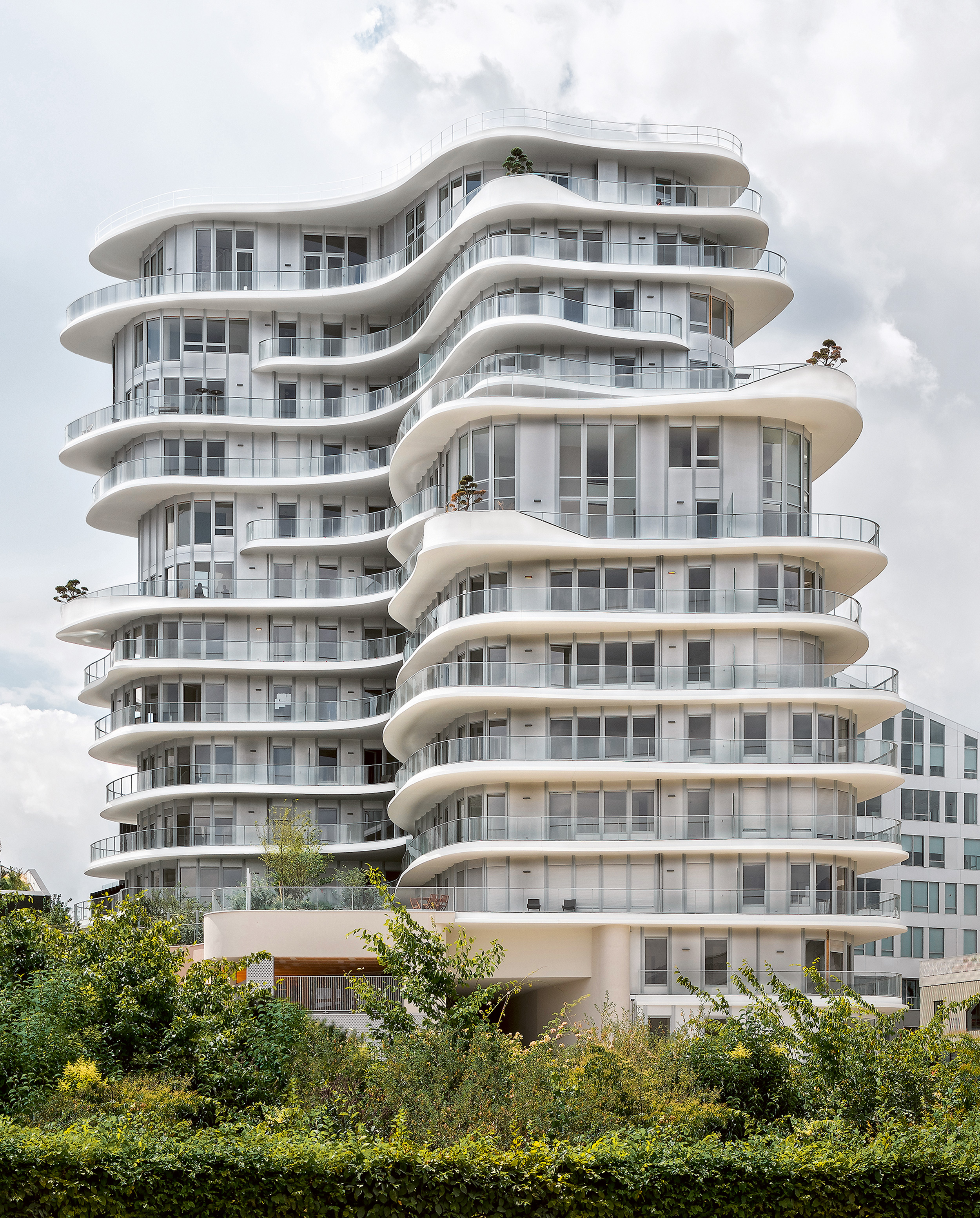 AE Interest: diverse socio-economic neighborhood, built on top of a former railway site, upward-growing organic arrangement, sustainable community development, asymmetrical, cantilevered, and tapered, curvaceous white concrete, a simple double core, connected to an adjacent public housing project.