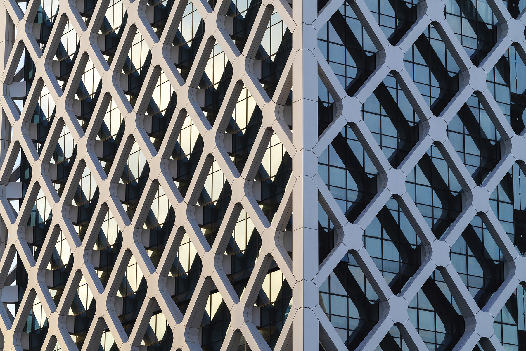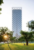 AE Interest: Diagrid structural facade made out of steel; LEED Platinum and China Green Star certifications; flexible mechanical system based on preference of inhabitants; green building practice that saves nearly 10% in annual energy costs; double skin wall for environmental comfort and visual privacy; entirely column-free floor plan; perimeter glass curtain wall on every floor and automated solar control blinds