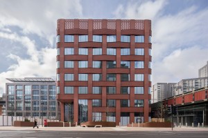 AE Interest: Facade is made entirely out of precast brick panels, interwoven in basket-like fashion; expedited construction process due to pre-fabricated panels; structure comprised of long-span, steel-frames; future service and circulation adaptation permitted; material construction was drastically reduced through floor-to-floor optimization that maximized sustainable recovery.