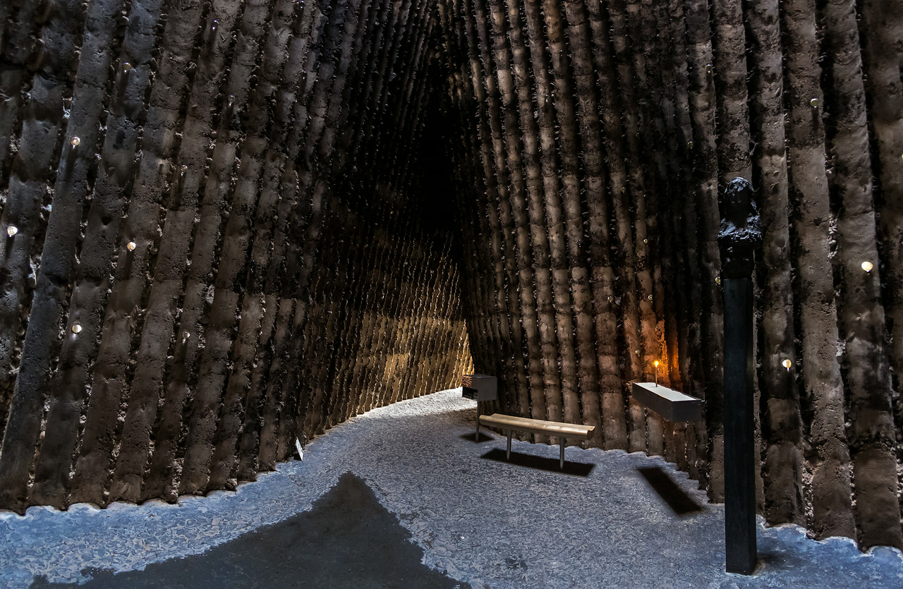AE Interests: Concrete structure poured in 24 layers, internal formwork made from wigwam using 112 logs, after concrete pour the wigwam was burned to give the charred internal finish, floor made from molten lead, complex geometry creates organic interior shape, sharp geometric exterior shape, reminiscent of cave worship, constructed by local farmers using the design from Zumthor, teardrop oculus lets light into main sanctuary