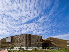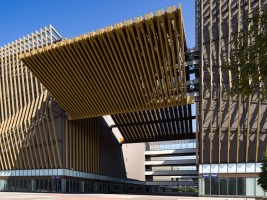AE Interests: Abstract design of a folding chair, façade separate from the shell of the building, baffles curve toward center of the building, parametric design principles used to create the façade