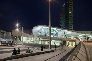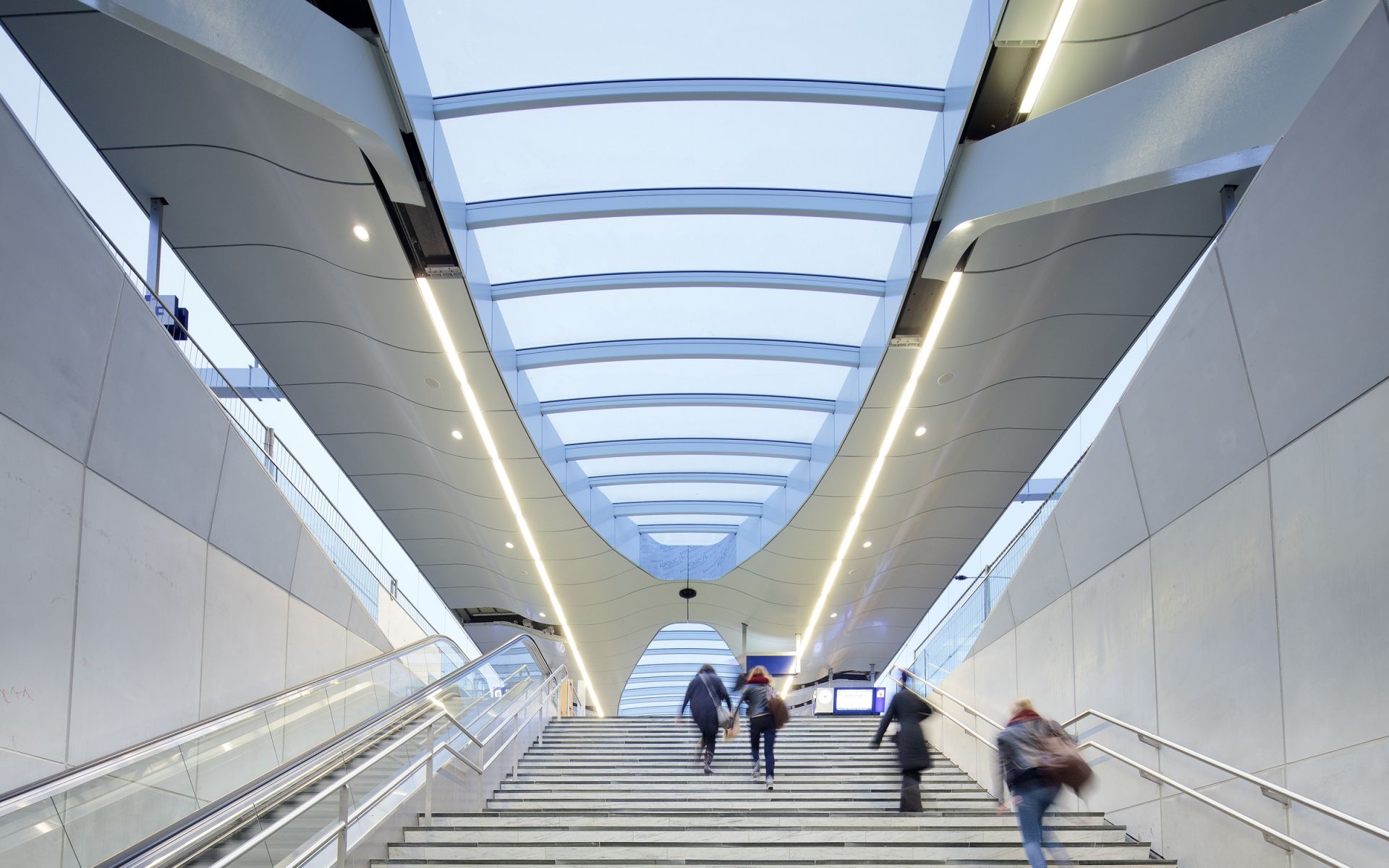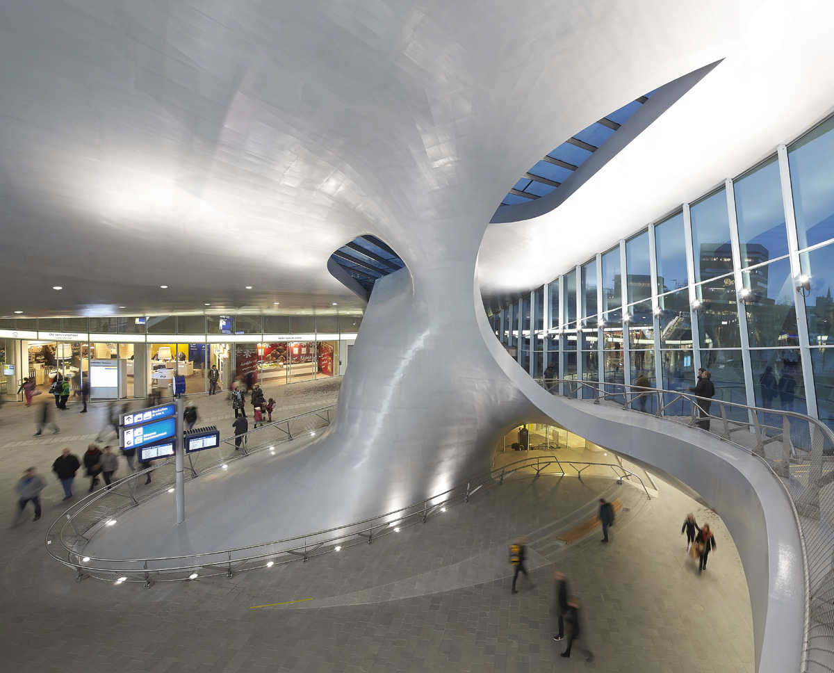 AE Interests: Lightweight steel twisting central support, Klein bottle inspiration for daylighting and form, Seifert shell-roof, column-free underground car park