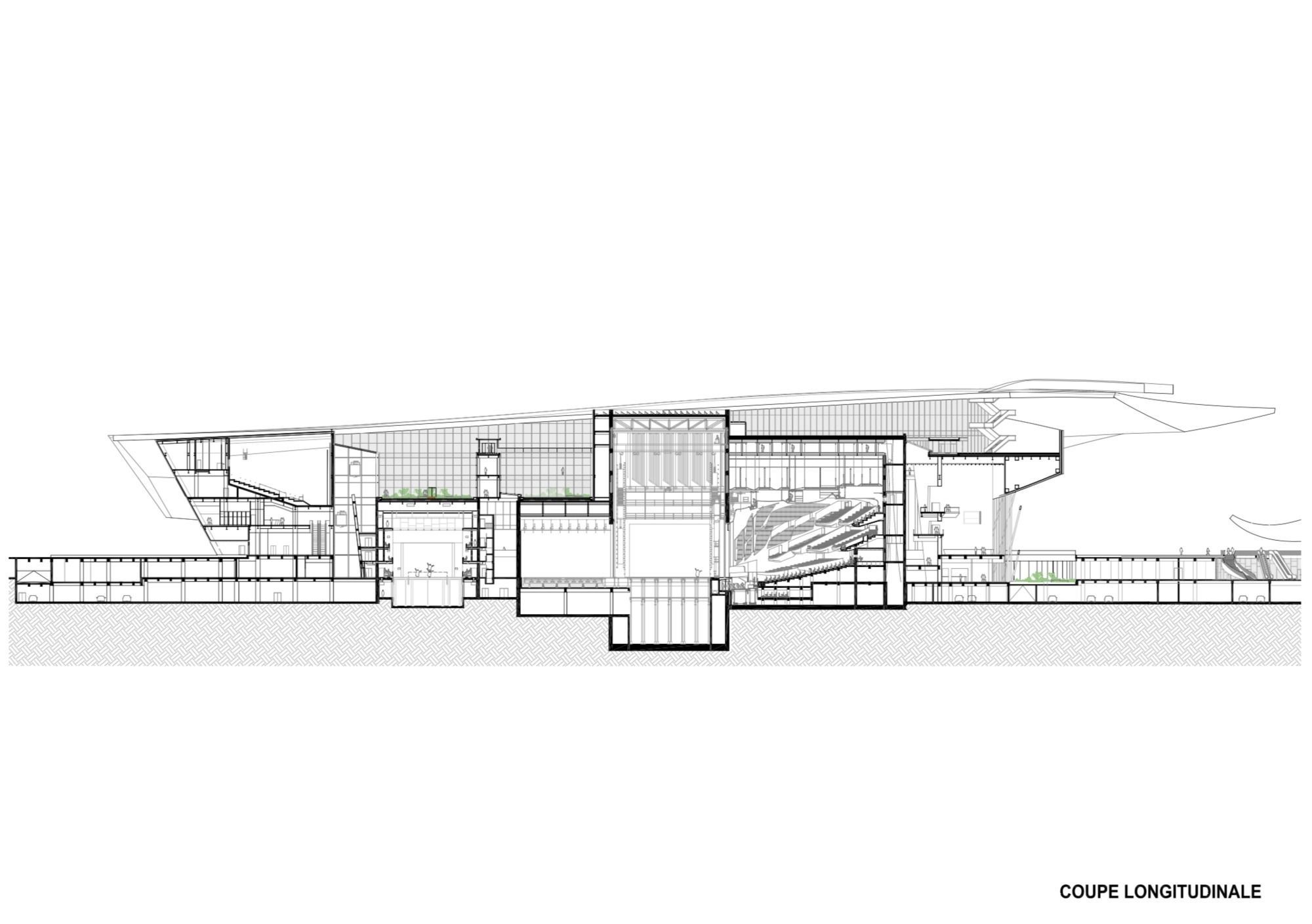 AE Interest: 1,600-seat opera house and 60,000 sqft opera house united by a 500m-long, 40-m-high metallic ribbon – the largest in the world; ribbons utilize space truss structures with rotating geometry and cantilevering 50m outwards; V-columns inserted into circular concrete columns and driven into the ground support the ribbons; in the opera theater, audience stands were used to help cantilever out many levels of seating; Rhino and Grasshopper were used to optimize design of curtain wall panels