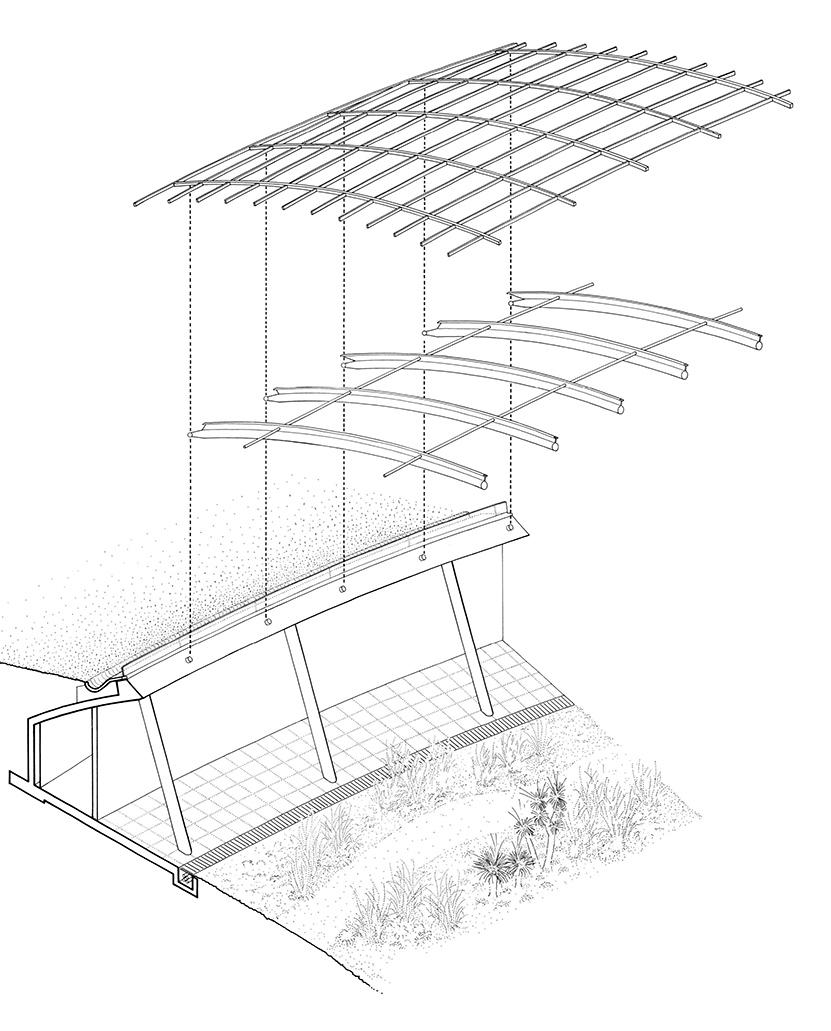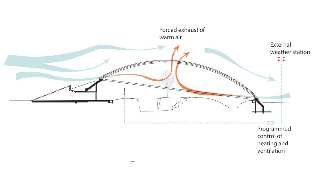 AE Interests: The Great Glasshouse is the largest single-span glasshouse in the world, with a glazed roof with a length of 99 meters and a width of 55 meters. Prime example of sustainability in design by the consideration for rainwater collection and biomass boiler usage to burn timber trimmings as the greenhouse’s primary heat source. A computer system monitors the climate of the inside and outside of the glass and reacts to exterior conditions by adjusting individual glazing panels’ angles to minimize energy consumption when controlling the interior climate. The dome is supported by tubular steel beams and aluminum glazing that maximizes light transmission for the plants it houses while minimizing the necessity of materials for the project.
