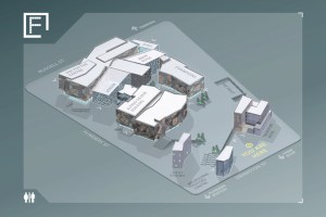 AE Interests: Urban renovation by building civic center on top of active rail yard; thermal cooling labyrinth to support passive-cooling system; pinwheel triangle grid façade; strategic urban design.