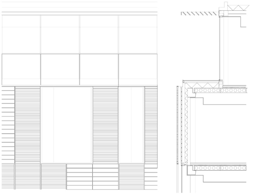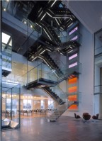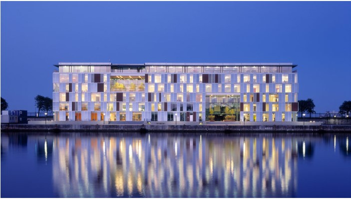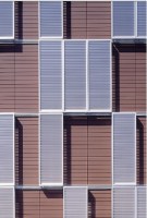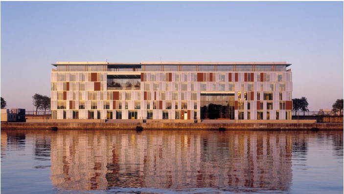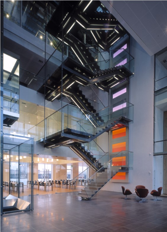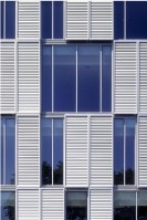 AE Interests: This building has a unique, ever-changing facade, consisting of a pattern of red brick tiles and large glass windows. Shutters move back and forth in front of the windows or the bricks, depending on the amount of sunlight desired inside. These shutters are the only sliding shutters in the world where the same electric motor drives both the frames and the tilting slats.