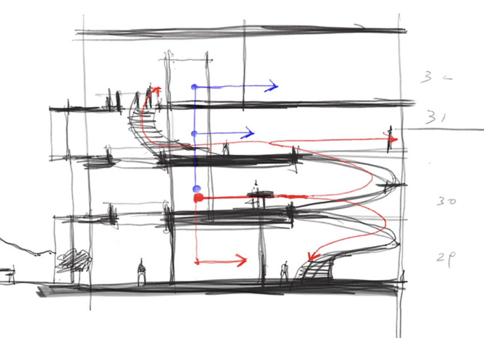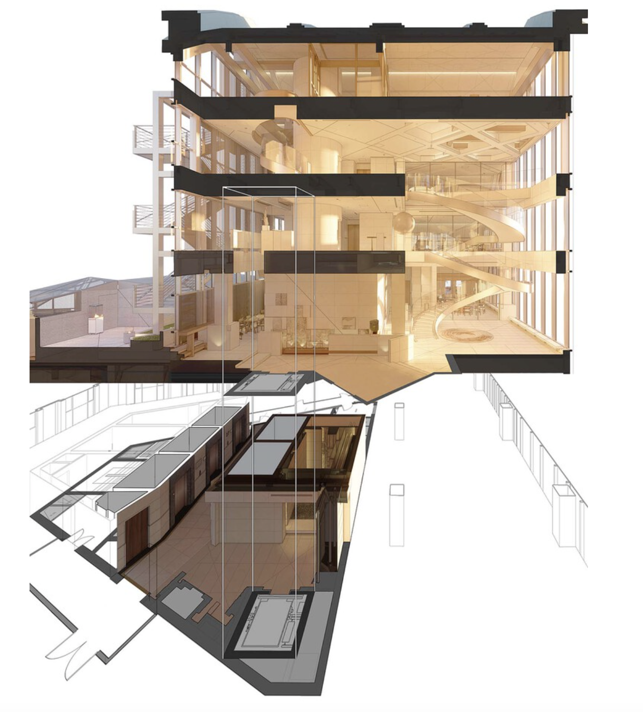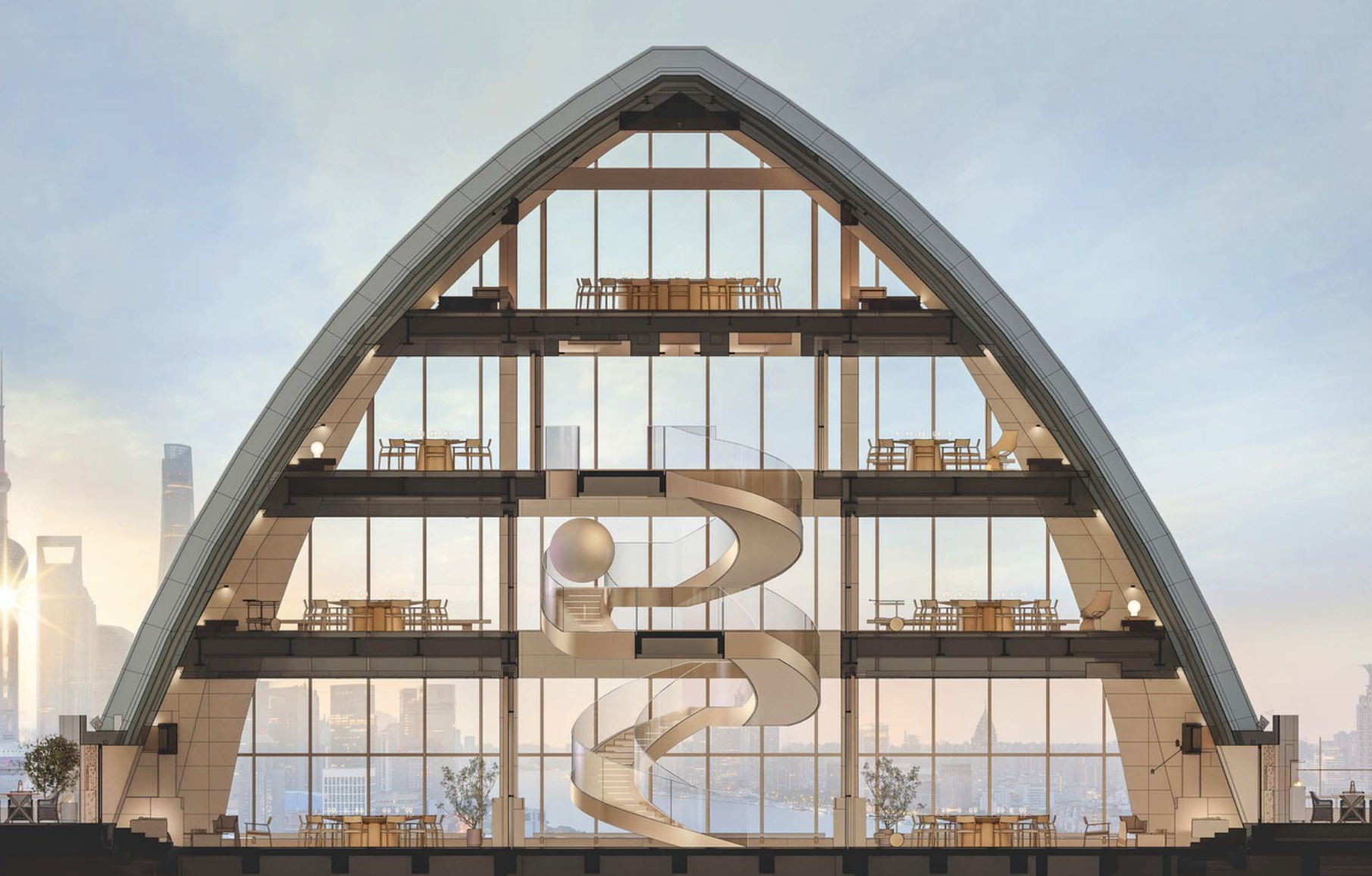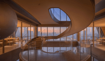 AE Interests: Design of the restaurant contrasts the buildings old aesthetic/ history – Large marble slabs, spiral staircase connecting floors 29-31, large glass panels surrounding the exterior, natural light, renovation at the top of an existing high-rise.