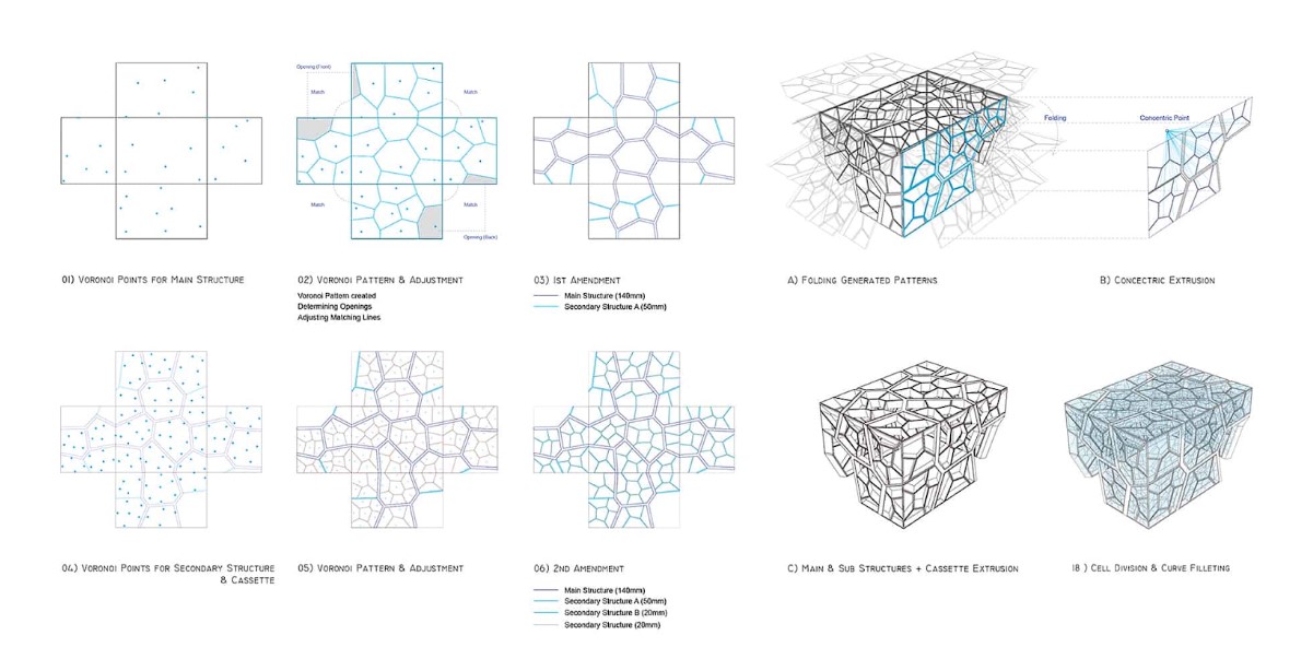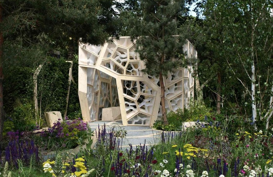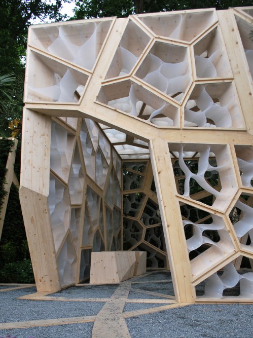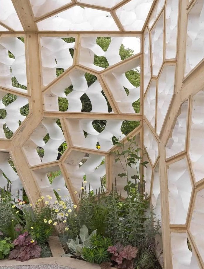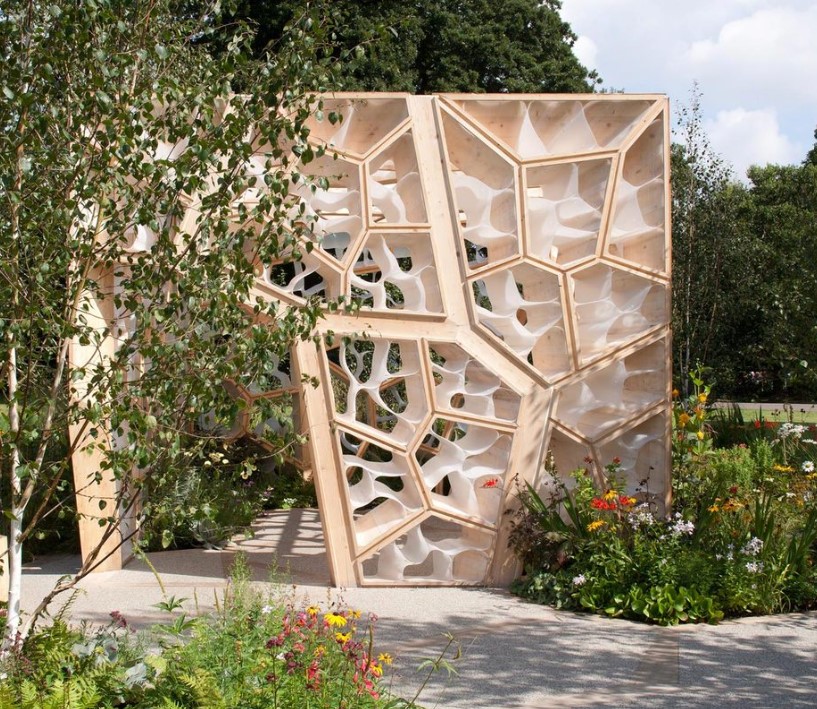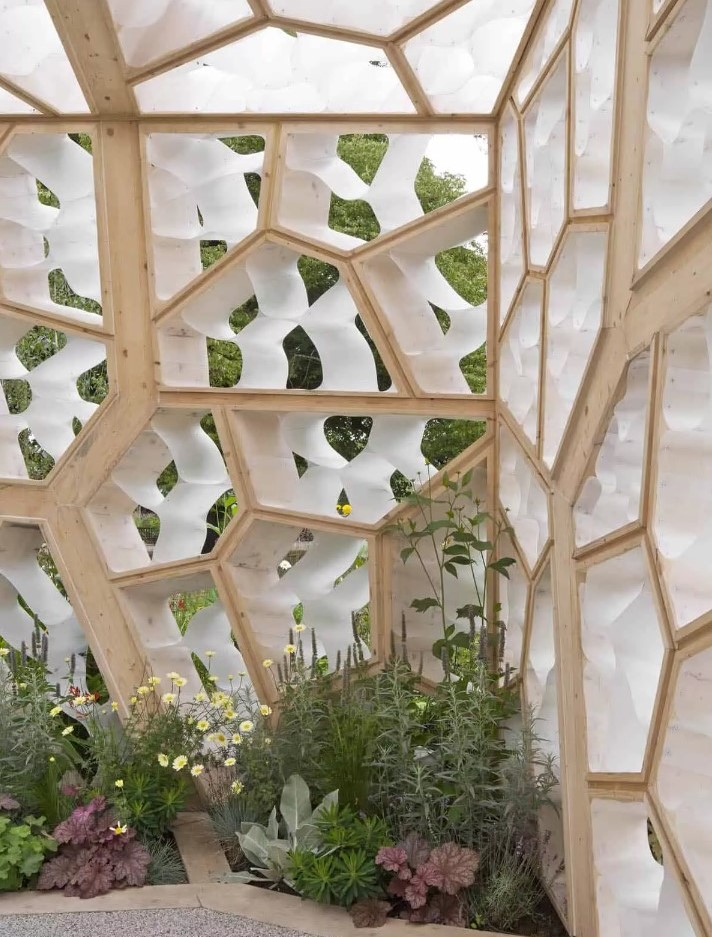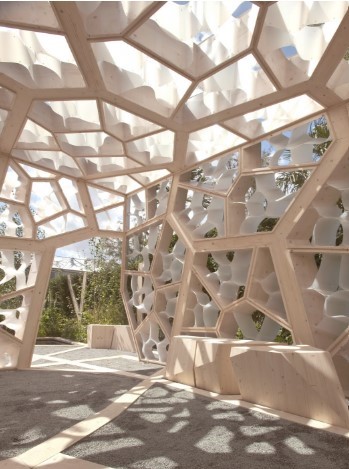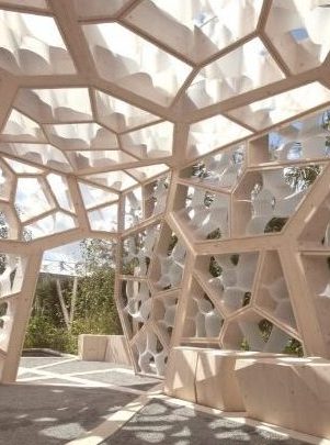 AE Interests: The design of this project was developed using algorithms that replicate leaf capillaries. Rainwater runs through the capillaries of the pavilion roof to the ground of the structure. This pavilion is made using entirely recycled materials and sustainably sourced spruce wood.