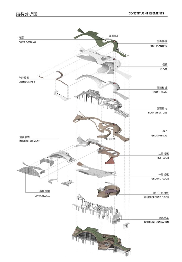 AE Interests: Steel Frame, Terracotta-colored concrete, green roof, concrete poured in situ, glass curtain wall, anti-slip surface finishes, undulating landscape, curving pathways and circular openings symbolize a worm-like movement throughout the center with the idea of reflecting the surrounding environment