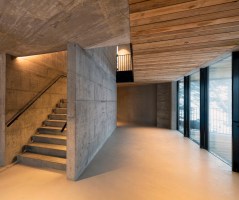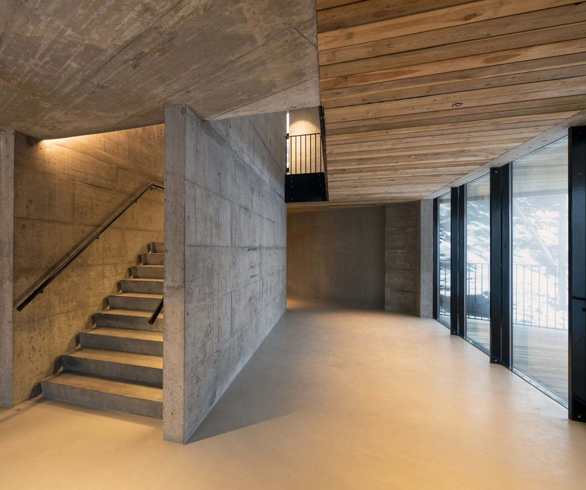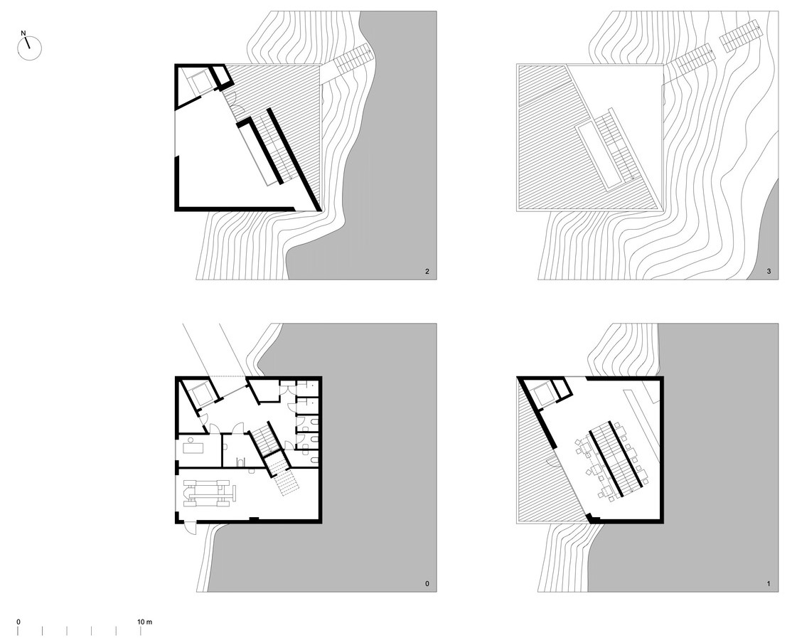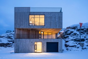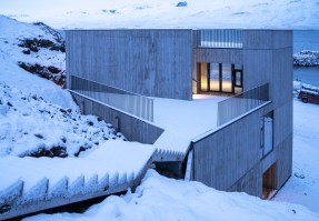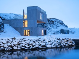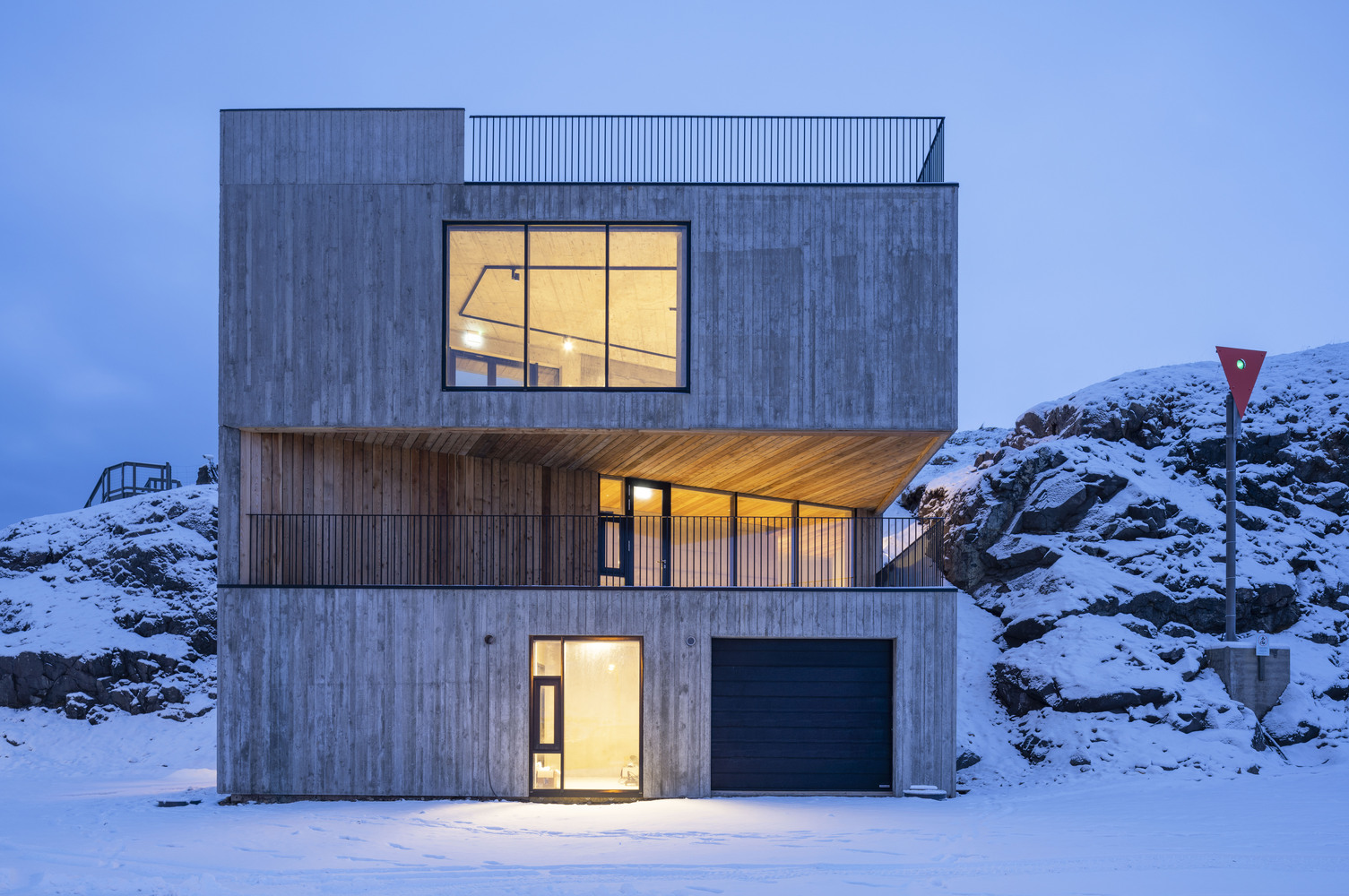 AE Interests: cube-shaped monolith with alternating outdoor spaces and different views of the landscape; cast-in-place concrete mixed with regional stone aggregates; underfloor heating drawing energy from the sea through a 400m long hose that loops under the pier; outdoor lighting aimed at minimizing light pollution