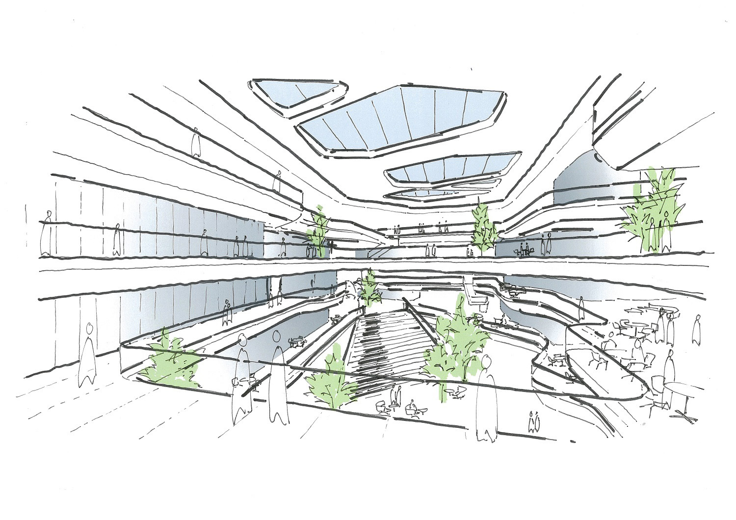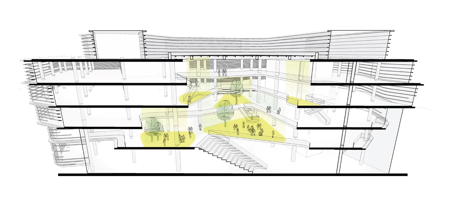 AE Interests: LEED Certification, Energy-Efficient HVAC Systems, Green Roof, Solar Panels, LED lighting systems, local sourcing of materials, proximity to public transportation, eco-friendly landscape design, design for human movement, open central atrium, curtainwall maximizes daylight penetration while reducing heat gain.