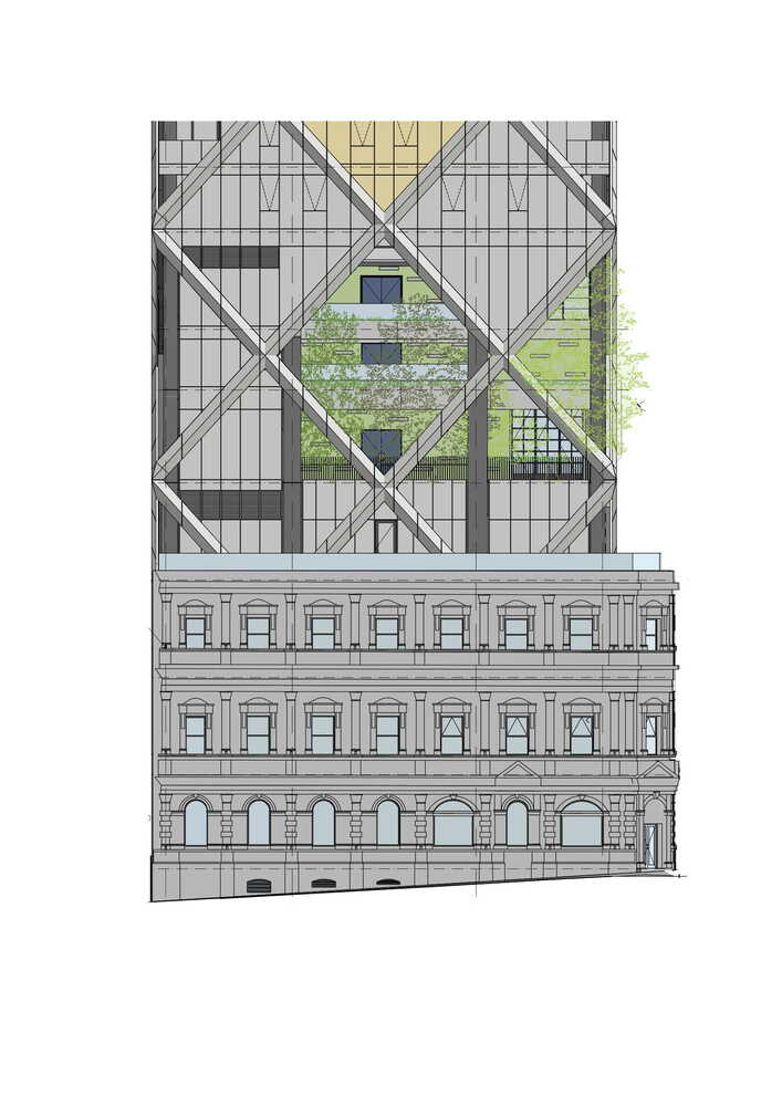 Architectural Engineering Interests: 5-star green star rating. Built on top of the existing building facade. Includes multi-floor green space near the center of the building. The first building in Australia to have an indoor green space. 158 sqm (1700 sqft) of vertical solar panels. The facade of the building is inspired by the Celtic heritage of the existing building. Shallower floor plates to allow larger amounts of natural light to each unit.