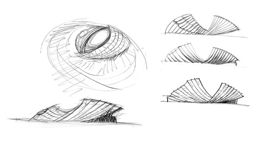 Architectural Engineering Interests: The entire layout is divided in two sections representing the exhibition and show. Contains theater with an open atrium in the center allowing natural lighting and an “eye” for a scenic view of the landscape. Laser shows are held utilizing a show pool between the stage and audience area. The theater is covered by huge arched roofs made up of modified metal plate cladding and material similar to local traditional elements of a nearby ancient village to blend culture with modernity.