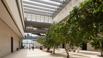 AE Interests: sustainability, passive cooling, biophilic design, retractable roof made from Ethylene Tetrafluoroethylene (ETFE), perforated aluminum screen/facade for shading, post-tensioned concrete structure, utilizes local Jerusalem stone cladding