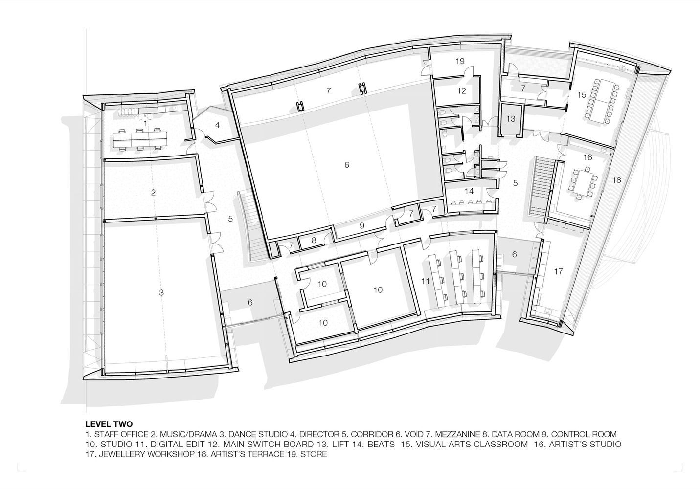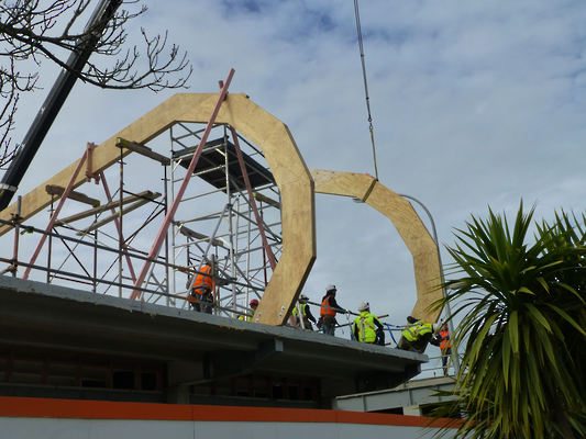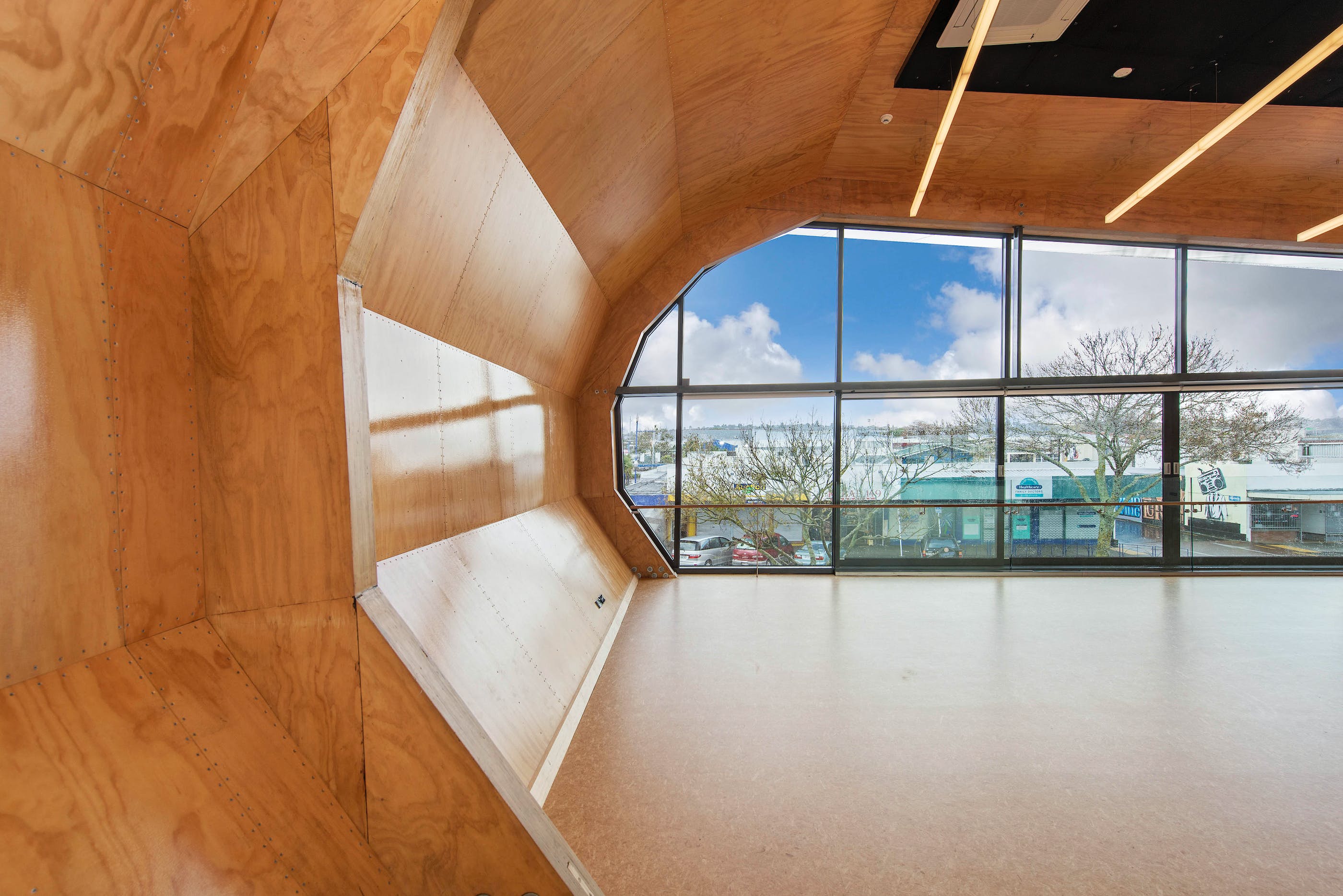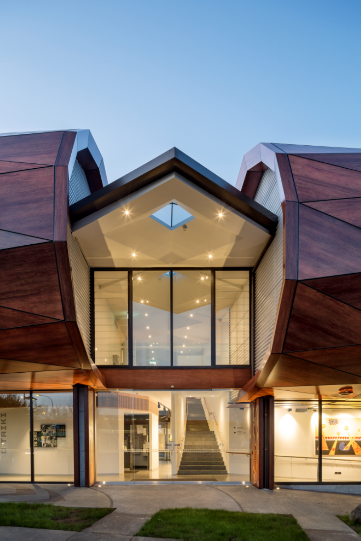 AE Interests: Unique curved roof and second story wall structure supported by thick wooden columns, laminated veneer lumber “ribs” provide structure and shape, net zero energy building, photovoltaic panels on roof, rainwater collection system