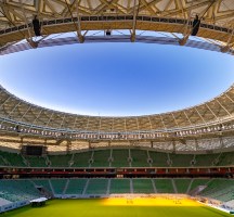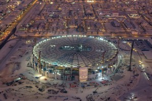 AE Interests: fiberglass facade imitates Middle Eastern male headpiece called a gahfiya, advanced solar-powered cooling units, hidden fans release cool air through grills in stands, upper deck of the stadium removed after the 2022 World Cup to create hotel space, intricate sunlit patterns created by perforations in facade