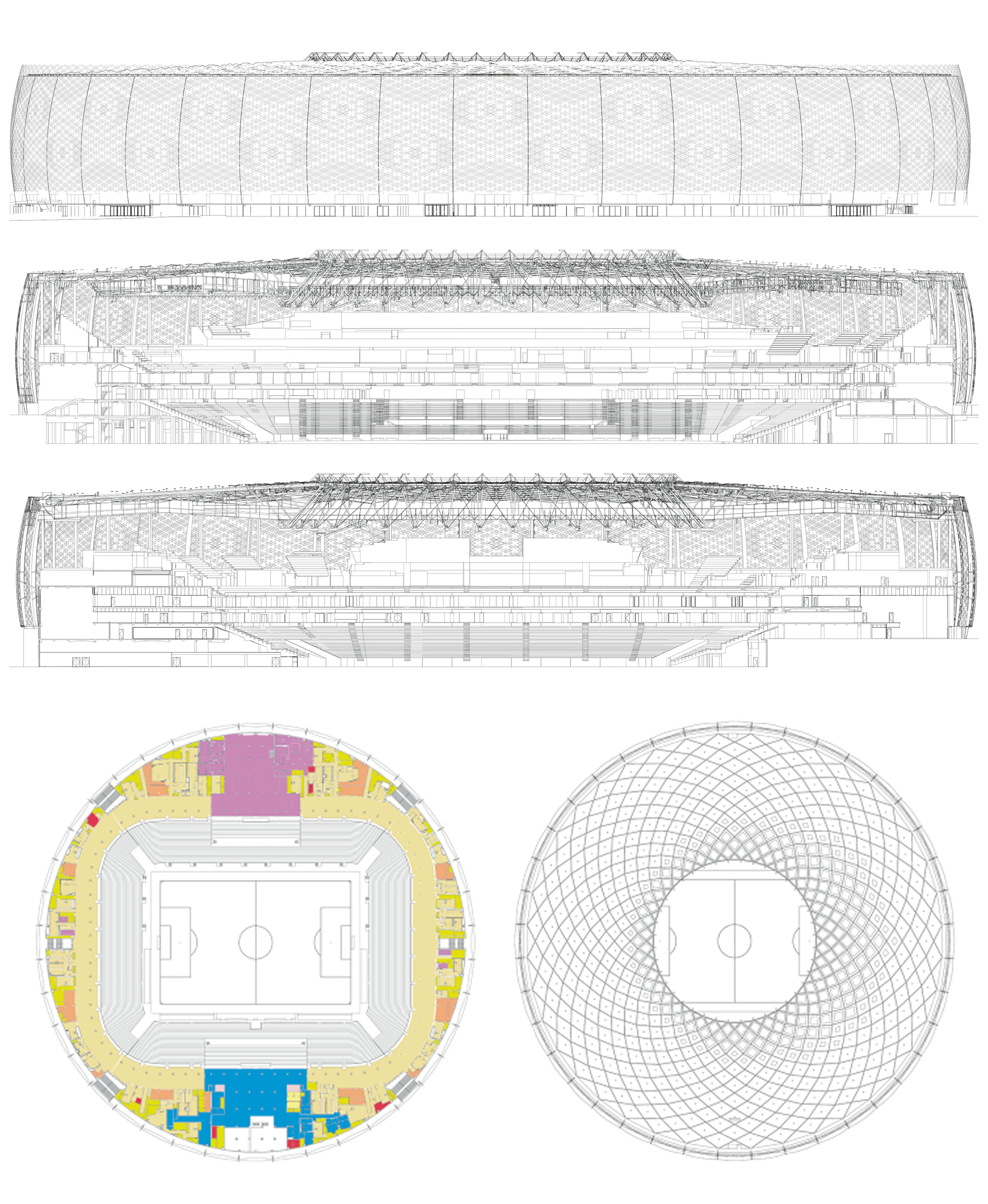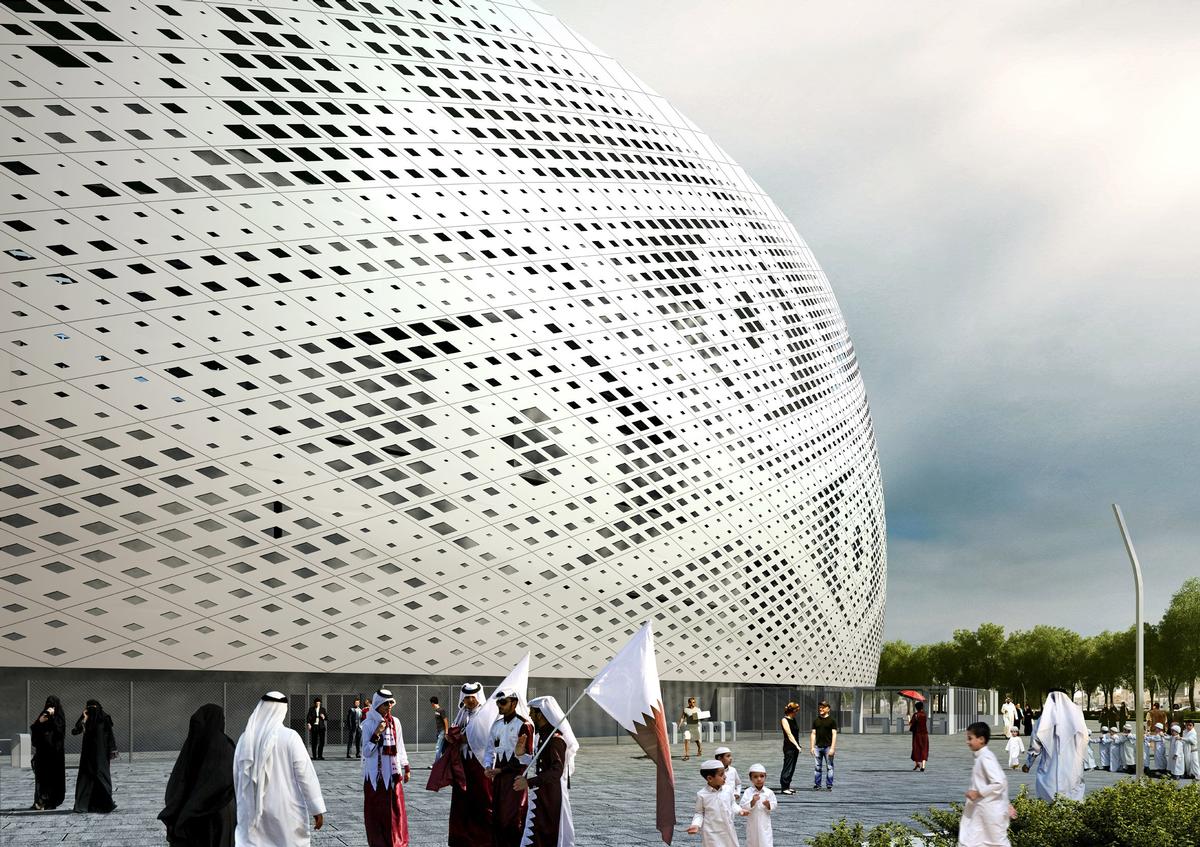 AE Interests: fiberglass facade imitates Middle Eastern male headpiece called a gahfiya, advanced solar-powered cooling units, hidden fans release cool air through grills in stands, upper deck of the stadium removed after the 2022 World Cup to create hotel space, intricate sunlit patterns created by perforations in facade