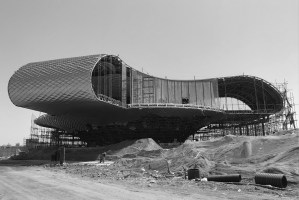 AE Interests: Integrated parametric design of 13,000 scale-shaped aluminum plates, reflecting façade over pool of water to resemble cresting waves. Upper-level curtain wall system (8m max height), no columns – complex network of steel trusses, central concrete core.