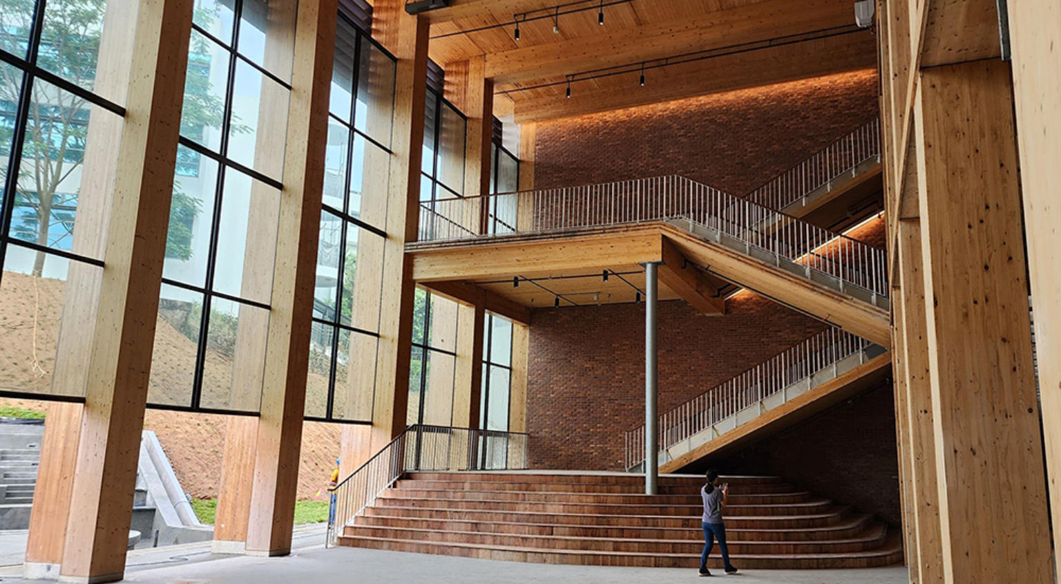 AE Interests: Mass timber elements (CLT and GluLam), ‘Green Mark Platinum’ Net-zero energy certified, energy efficient envelope, passive displacement ventilation, “Largest” wooden building in Asia (by volume of timber) – 6 stories and 220 meters long, 190 seat auditorium, lecture halls, laboratories, open air terraces with green space.