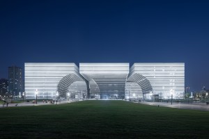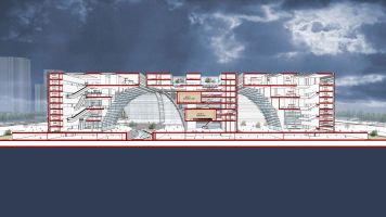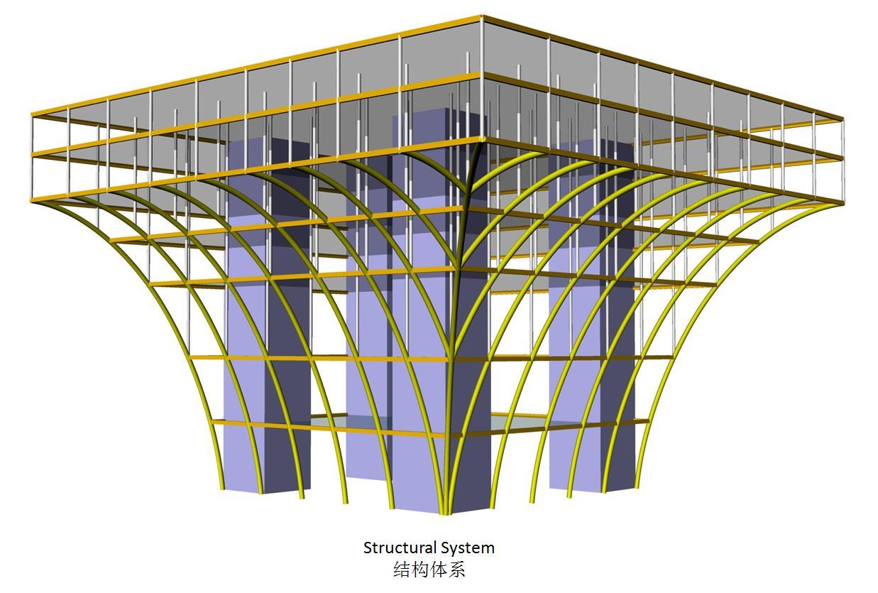 AE Interests: landscape integration, multi-function building design, facade lighting design, curved facade, large cantilever overhangs, aluminum louver solar screening, reinforced concrete core with diagonal cantilevers, compression arches, column-free “sky gardens”