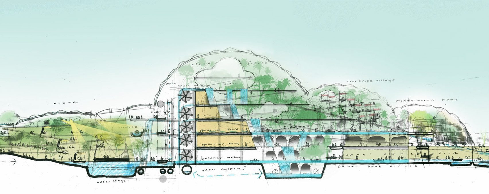 AE Interests: biome structure 27,000 square meters large, 200 acres of land regeneration, landscape architecture, trusses, world’s largest indoor waterfall, ecological park, efficiency of nature, column free lattice dome, loads flow by arch and shell action
