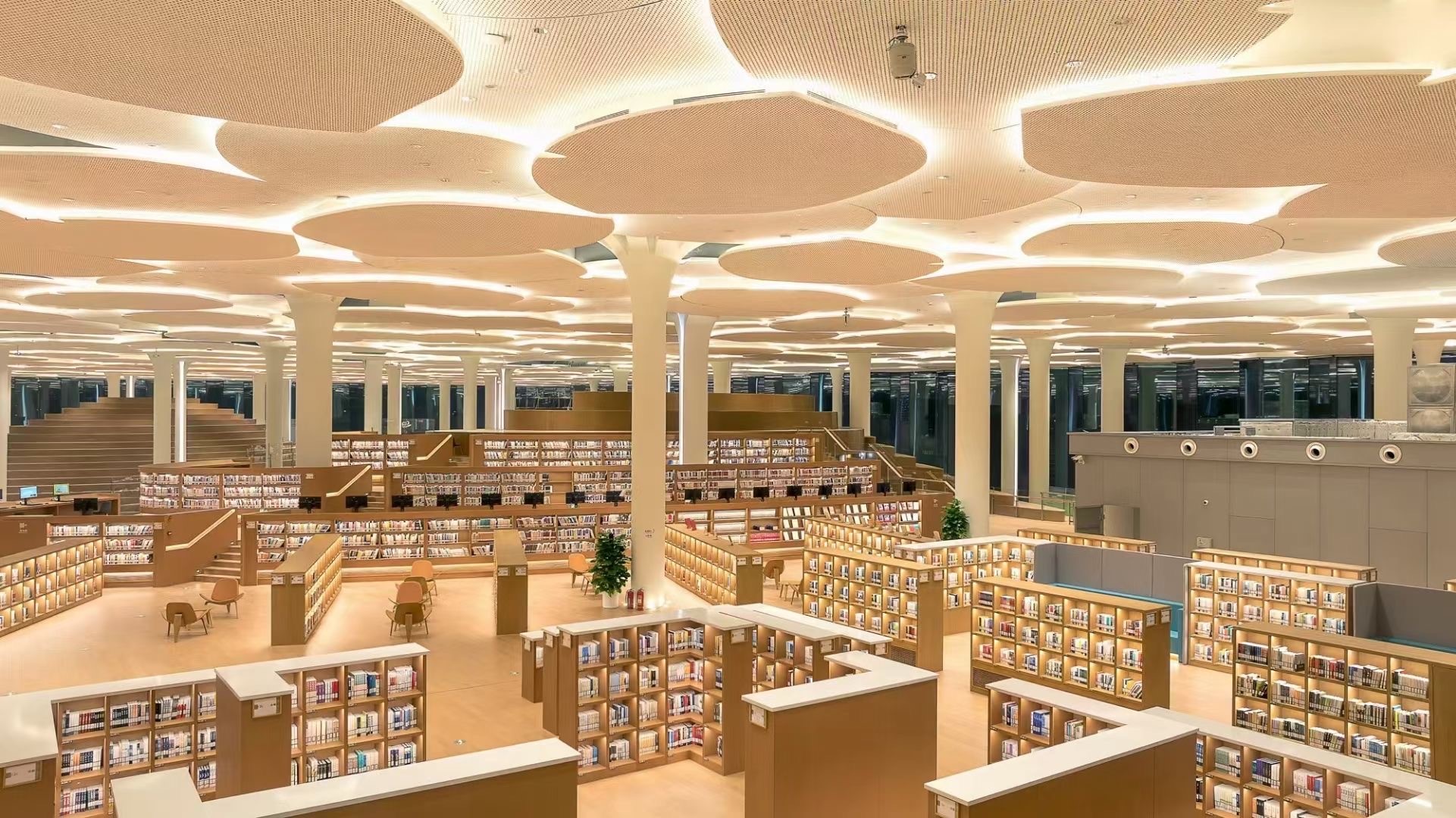 AE Interests: Is the world’s largest climatized reading space, and China’s largest load bearing glass system. Throughout 2024 they had almost 4 million visitors. The panels on the roof are meant to mimic ginkgo tree leaves, with the interior mirroring the course of the neighboring Tonghui river.