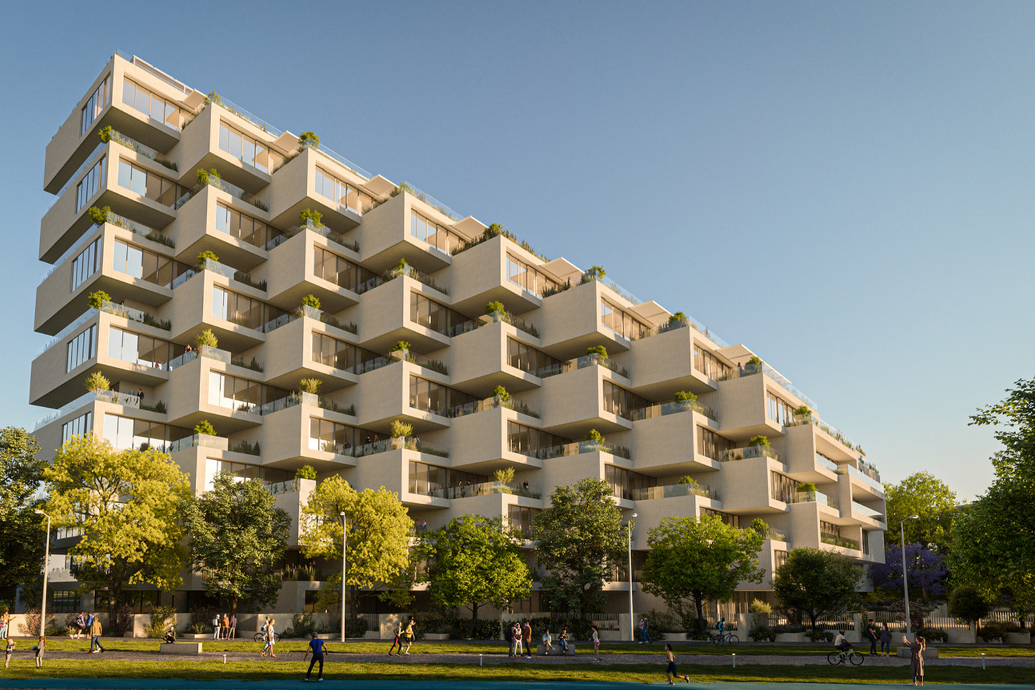 AE Interests: 164 feet tall residential complex, 28,772 square meters large, 5 core stepped composition, has 88 homes with private terraces, a passage to the Metropolitan Park, fitness and pool amenities, targets LEED Gold standard