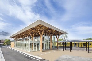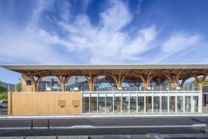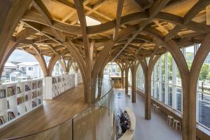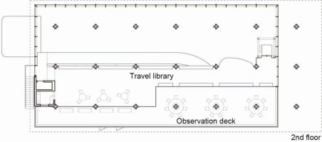 AE Interests: Site area 1,025.5 sqm, Building area 491.66 sqm, Floor Space 624.21 sqm, wood laminate supports in Y shape, curvilinear wood laminate joists, second layer of wood lattice, observation deck, steel framing, ramp to second floor.