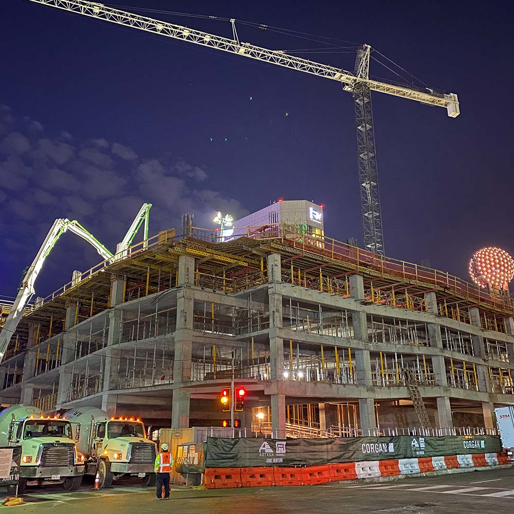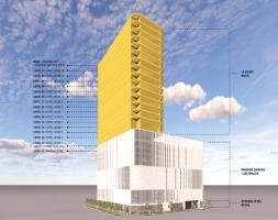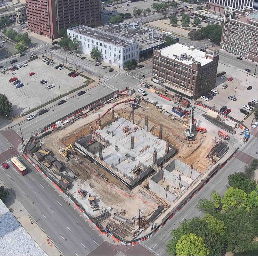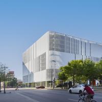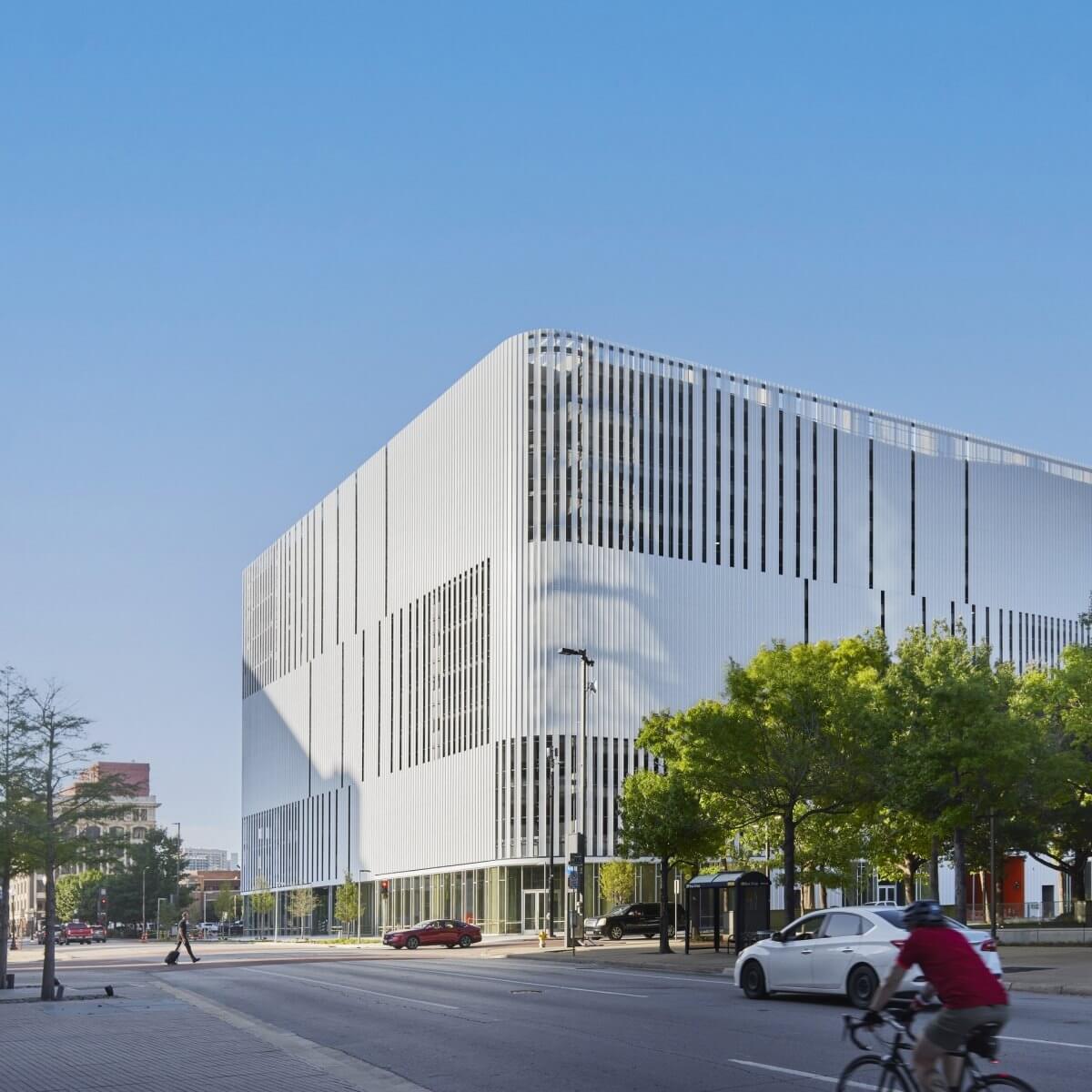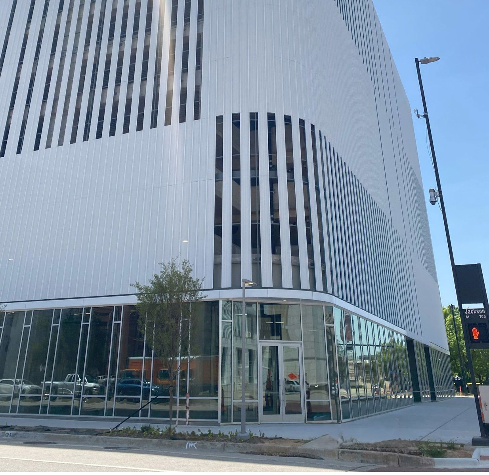 AE Interests: 12-story parking garage with a perforated metal panel façade, constructed with load-carrying embeds to allow future vertical expansion up to 15 additional stories, featuring a flexible structural layout with wide column spacing and open floor plates for easy mixed-use adaptation.