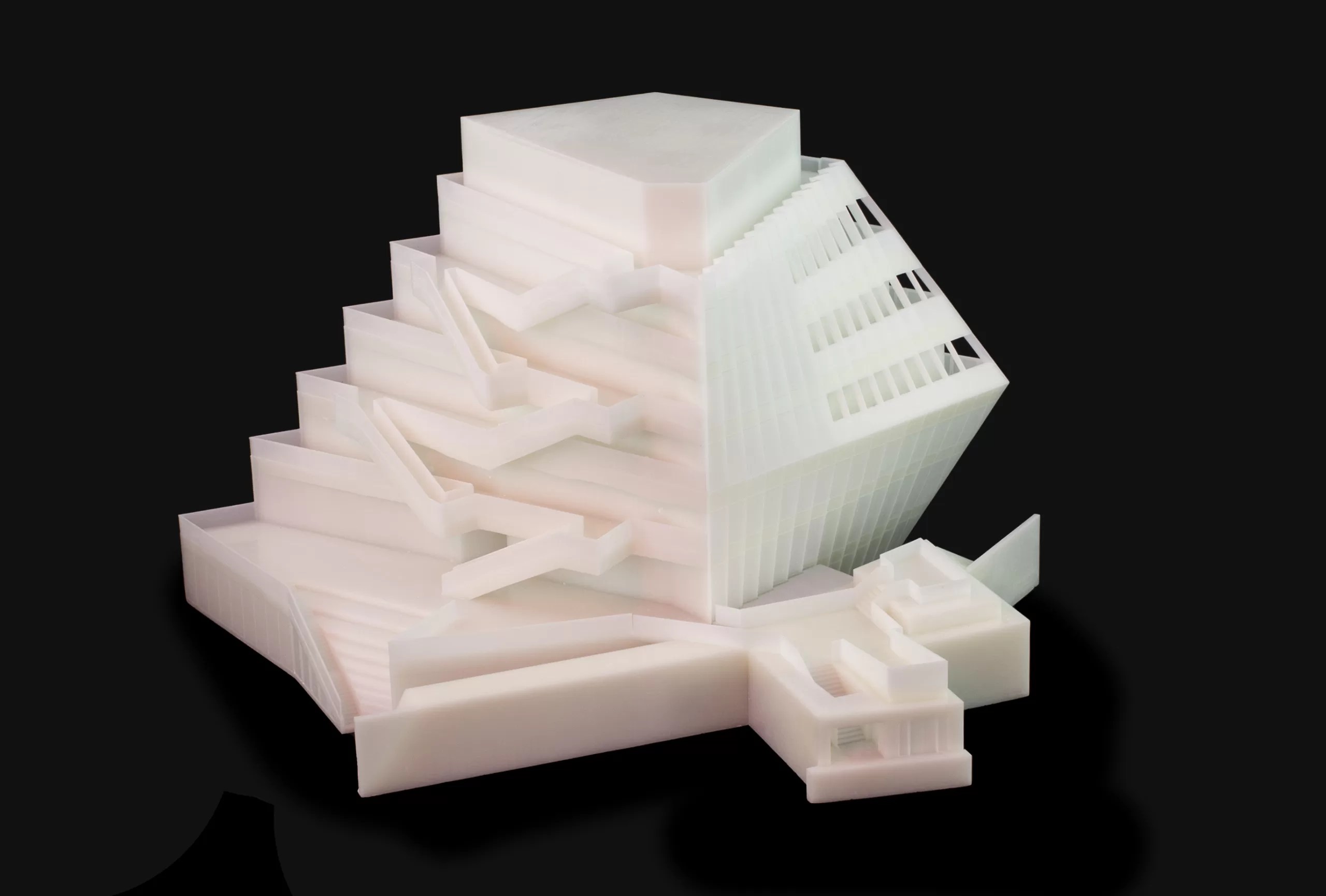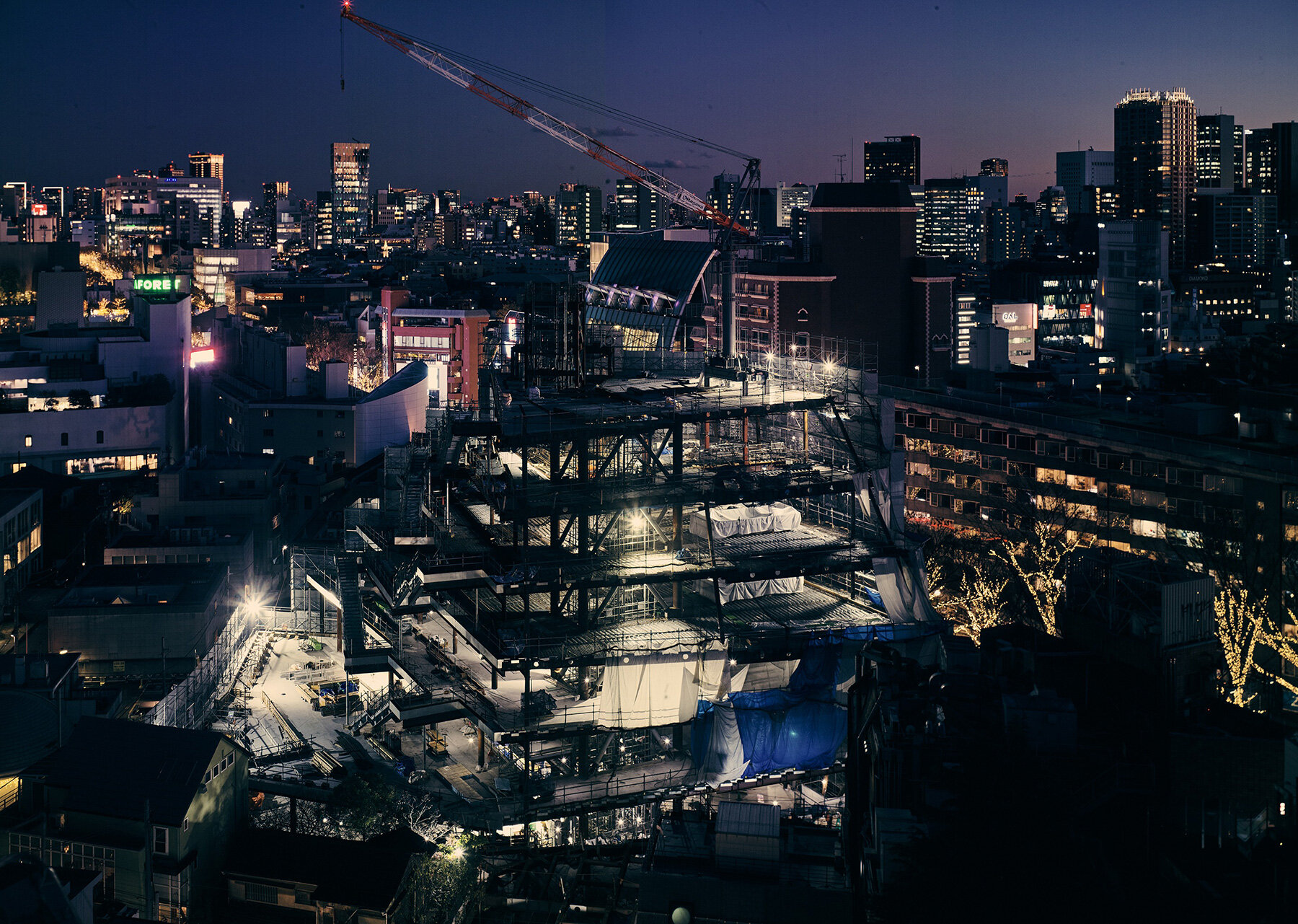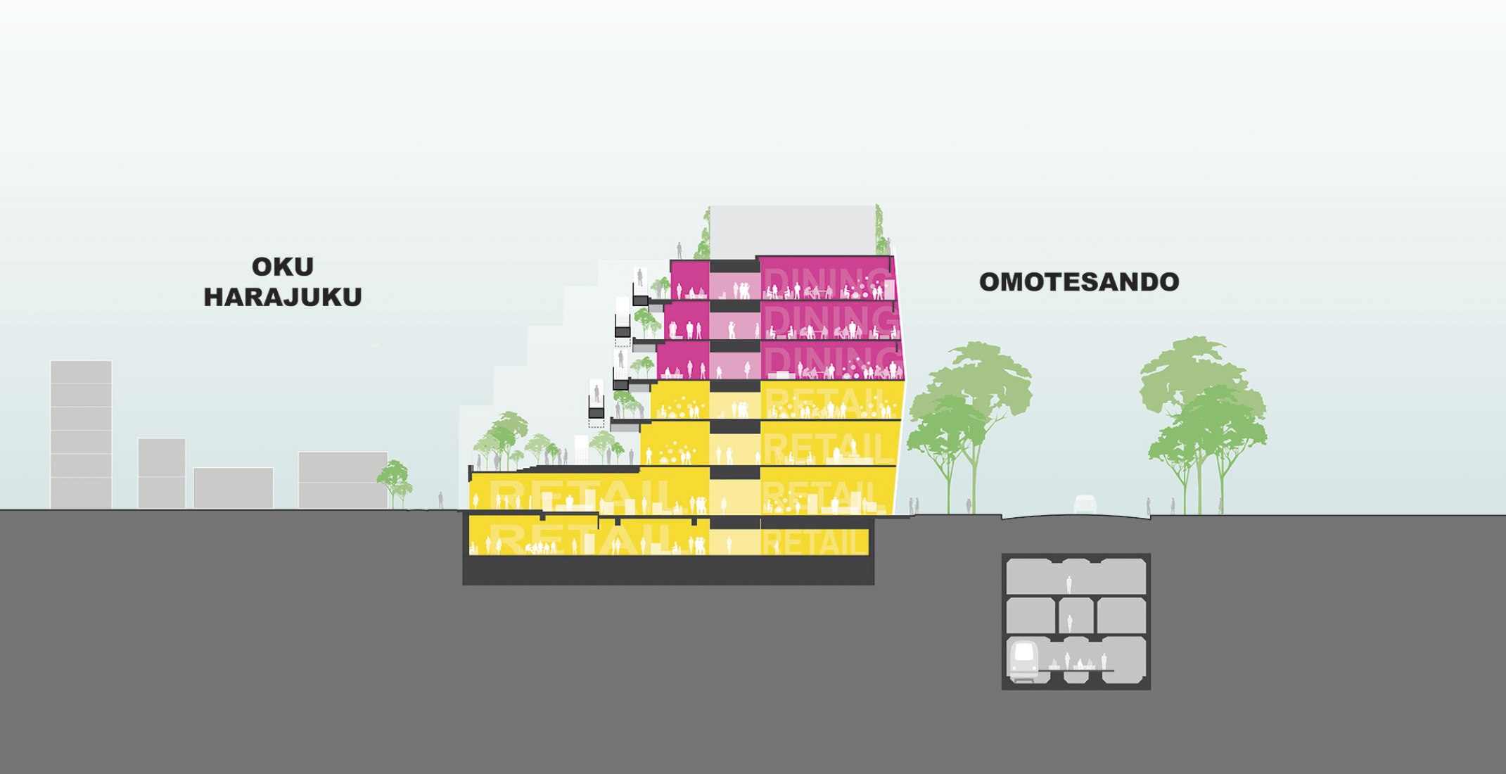 AE Interests: Living walls on rooftop, glass facade, monolithic & transparent face, convex shape, stepped terraces, mixed-use shopping center, open-air platforms, set back at the street creating a funneling passage into Oku-Harajuku, set-back at the top to bring light in, second-level public plaza
