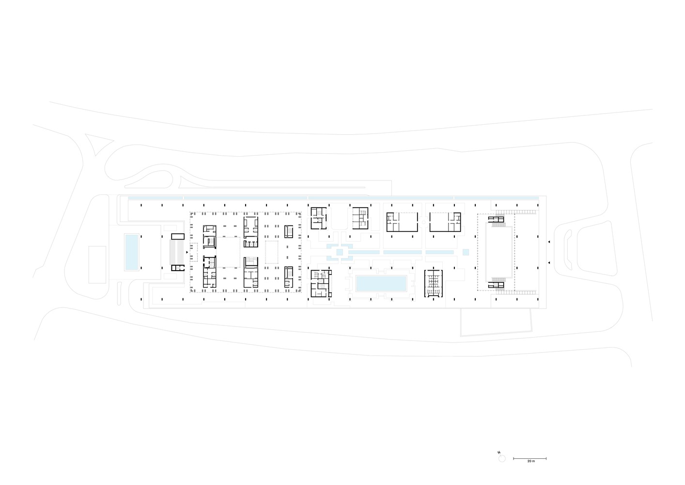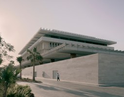 AE Interests: refurbished hotel structure, brutalist form, rhythmic facade, brise soleil canopy to provide shading and incorporate shadows, 90 hotel rooms over 3 upper levels, White Calacatta, green Tinos marble, and travertine material used, concrete rib exterior, sustainable reuse