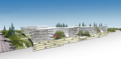 AE Interests: LEED Platinum, curvilinear, transit-accessible campus, over 1,400,000 square feet, cast-in place concrete buildings, inspired by nature, curving glass facade, interior courtyards, rooftop gardens, under-building podium parking