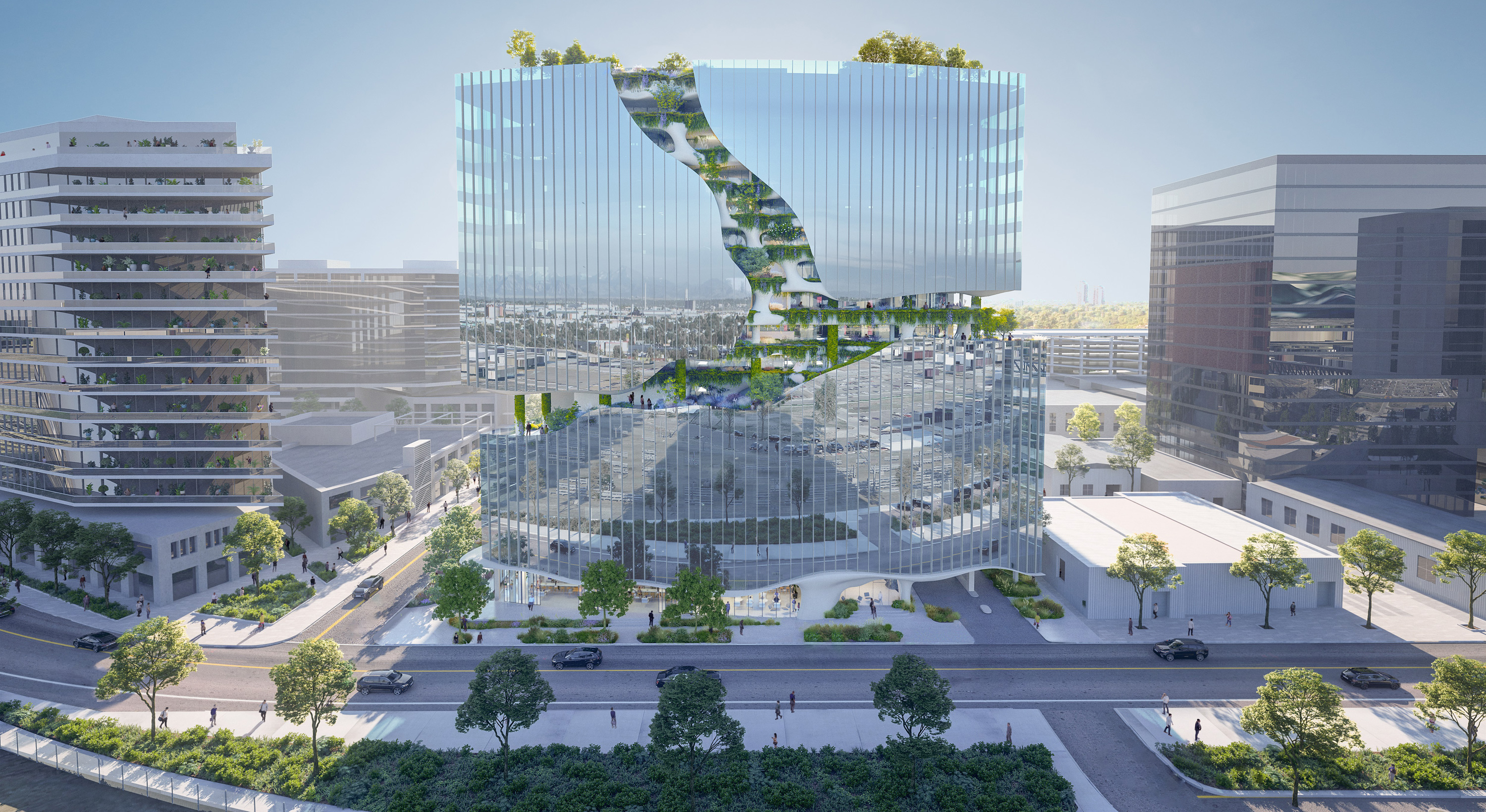 AE Interests: Biophillic “Vertical Canyon” Design to mimic landscape. Combination of glass curtain wall and sculpted EIFS panels (100 ct, 3-4 stories high each).