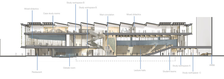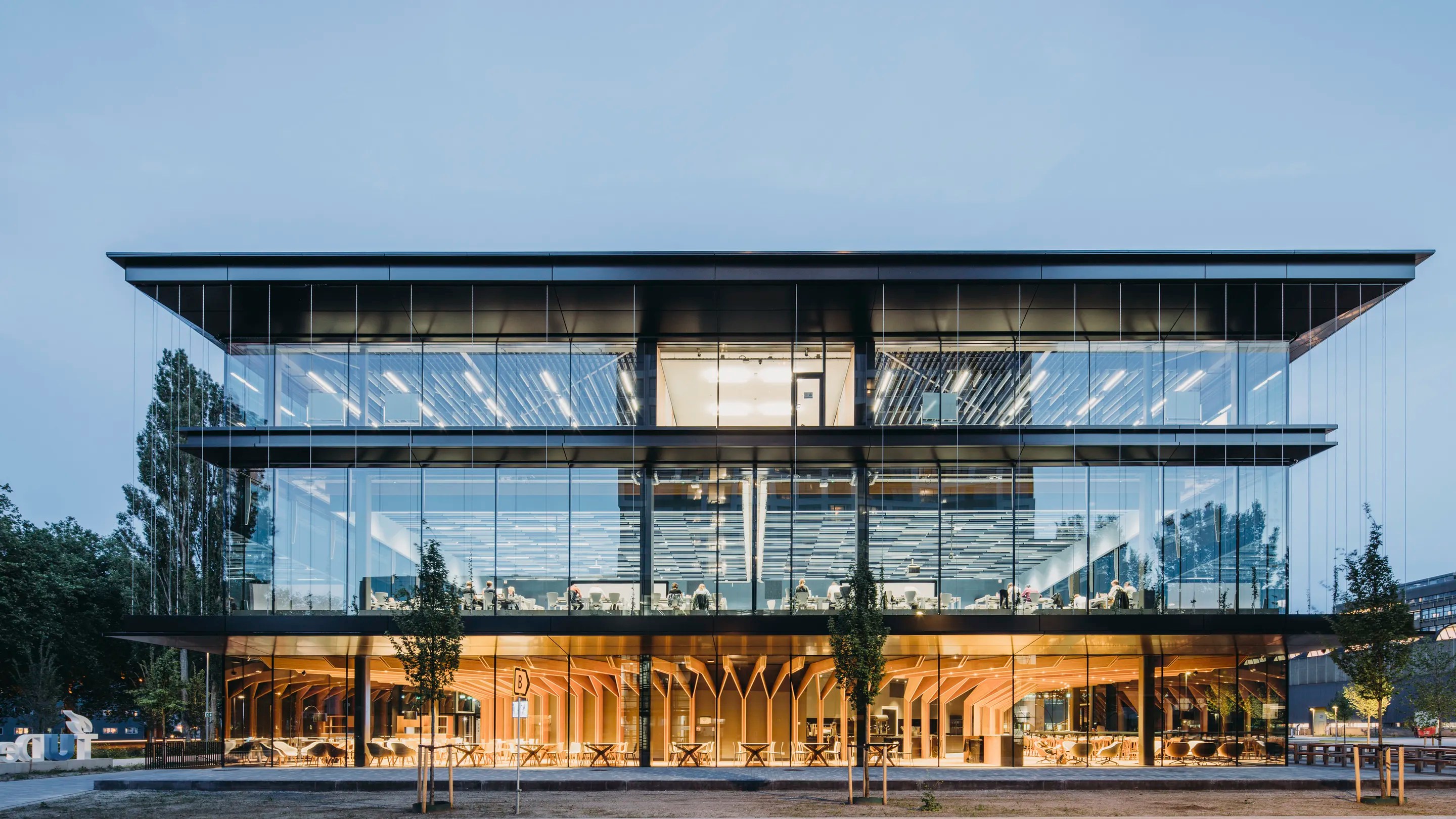 AE Interests: Energy-positive teaching building with rooftop solar and underground thermal storage, transparent facade with shading and living plants, circular steel structure designed for reuse, passive displacement ventilation, column-free flexible interiors with divisible 700-seat hall, reused furniture, and public ground floor as campus connector.