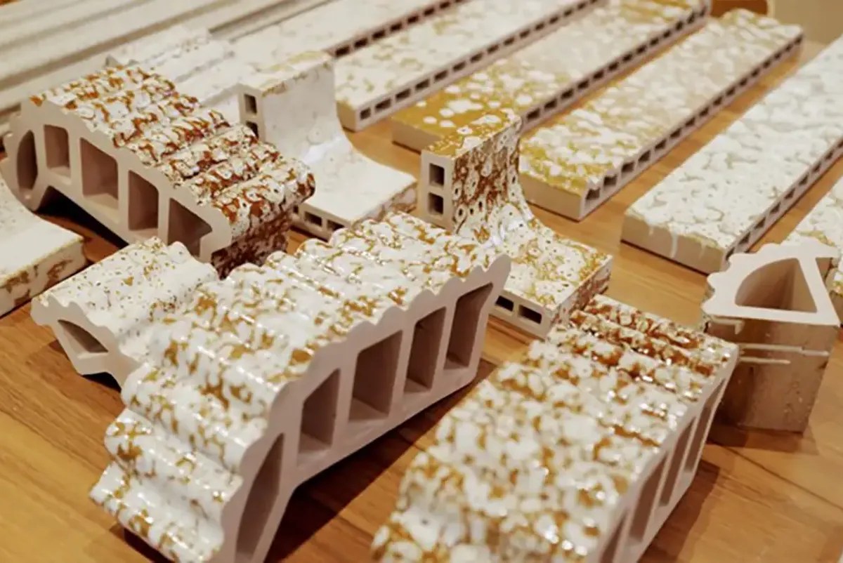AE Interests: fast-tracked construction, glazed ceramic tiles lining facade, stepped roofs with garden terraces, 8 unique leaf-like skylights, curved beams, stone paving, detailed timber for accents and handrails