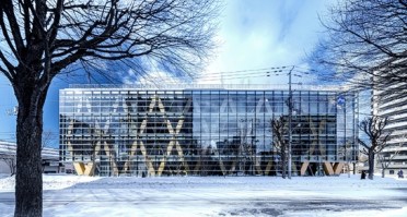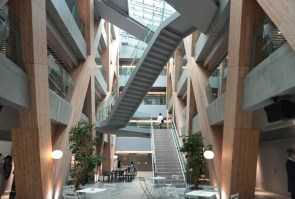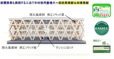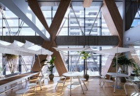 AE Interests: The structure of Air Water Forest is made out of wood with steel frames that are used across the 90,654 sqft building. It is four stories tall and features exposed wooden supports that are made from fire-resistant laminated lumber sourced from Hokkaido larch.