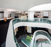 AE Interests: This four story, 23,013 sqft building is made of reinforced concrete. Through the integration of natural light and air, the building is designated as energy-saving ZEB Ready. Takenaka decided to reduce the environmental load by using recyclable materials for interior and exterior finishes of the building. Since the structure had to make use of its peripheral walls, the engineers used rebar to release the building from lateral loads.