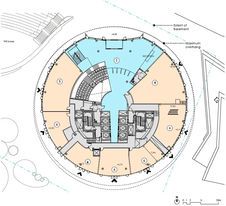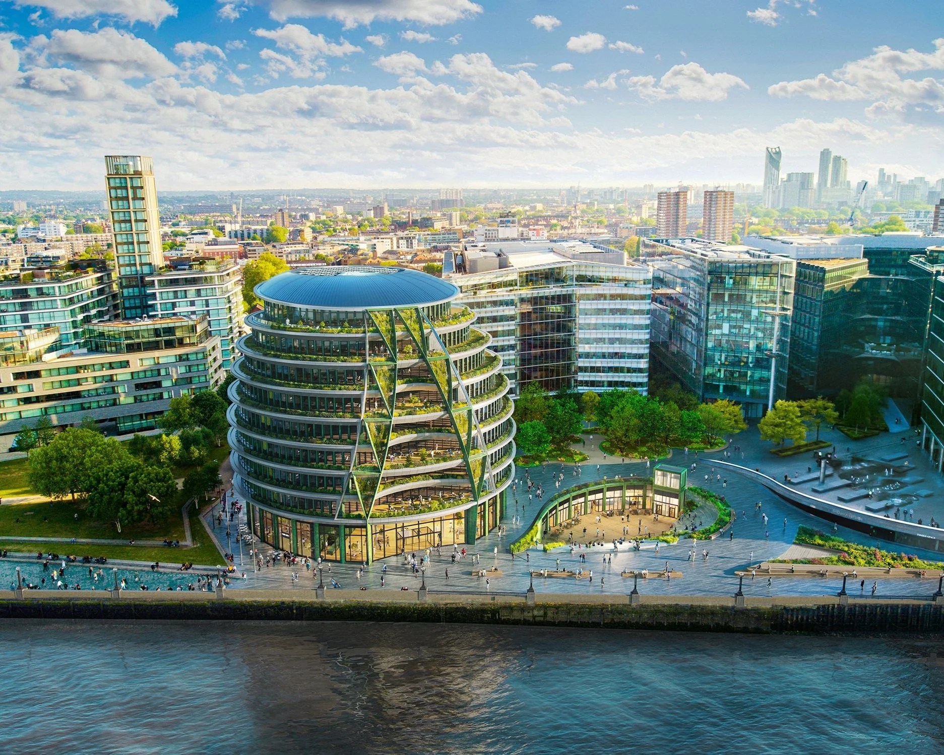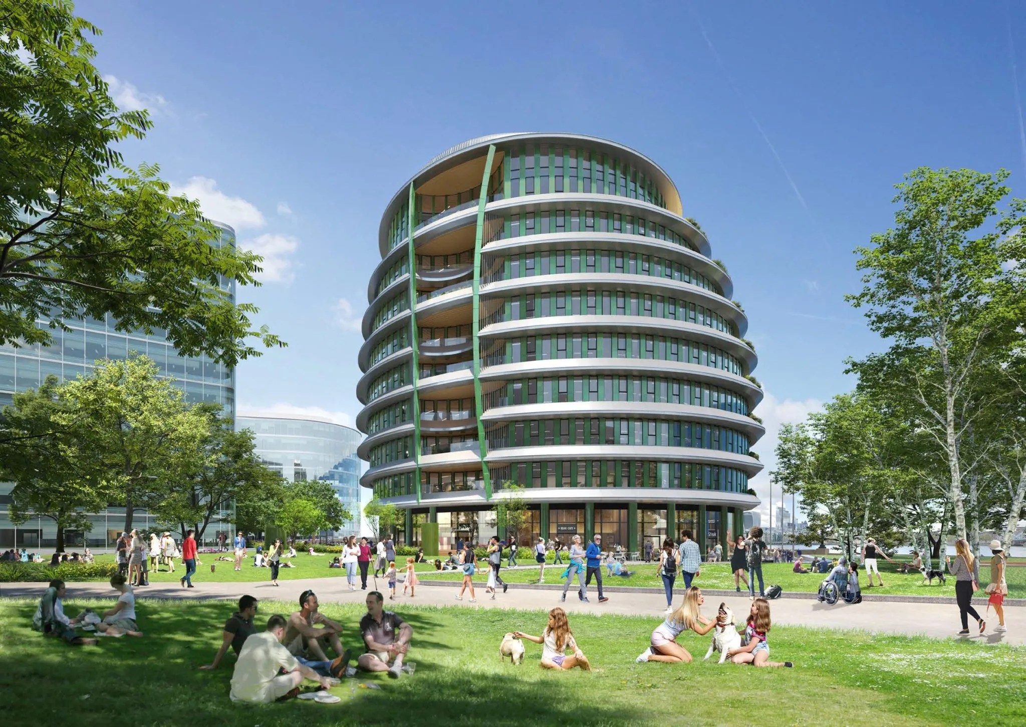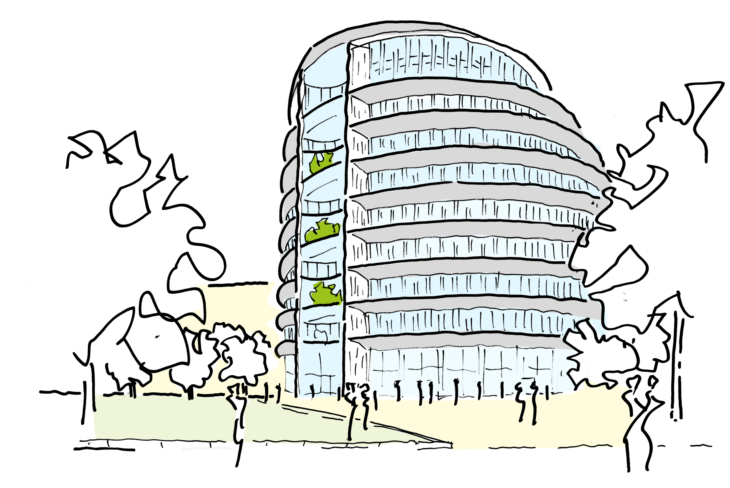 Curved silhouette, mixed-use accommodation, sustainable, rounded terraces, flat roof, existing building, straight south facade, vertical elements enclosing balconies, curvature, fostering a morde dynamic environment, embodied carbon is minimised, passive and active sustainability, recyclability