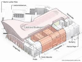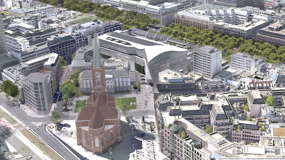 AE Interests: sustainable modernization, 135-foot curved and vaulted roof, large-span structure, opening glass roof, integrated solar panels, landscaped roof terraces, sinusoidal inner façade, complex façade geometry, triangular footprint, mixed-use retail/office, historic façade preservation, seamless connection