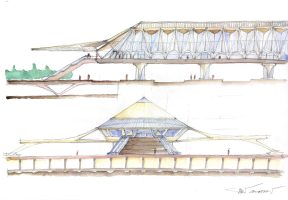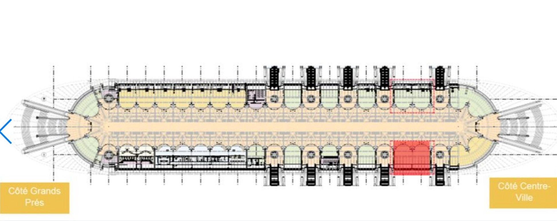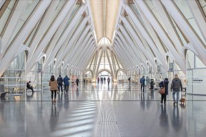AE Interests: Multi-modal hub, city-linking bridge structure, 165-meter raised gallery, exposed triangular steel truss, large-span glass and steel roof, rhythmic structural ribs, branching supports, operable skylight, high-performance glazing, curved glass façade, underground parking integration