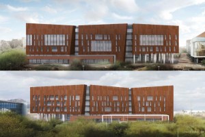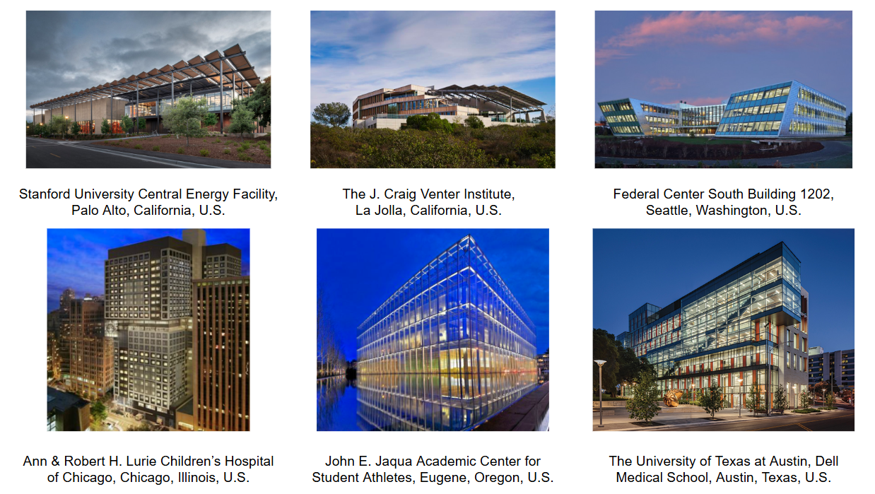 AE Interests: A $120 million project featuring 189,759 SF of research facilities, five stories plus a basement, a dual-skin façade with a copper screen for solar shading, LEED Platinum certification, a design for flexible lab and office space, advanced research equipment, and a concrete and steel structure optimized for vibration control.
