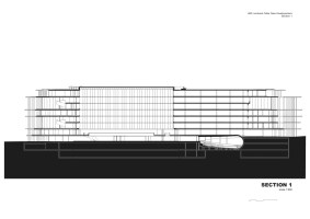 AE Interests: eight stories with two subterranean floors, curved concrete structure, slender column grid, glazed facade, cantilevered slab, one roof concept, collaborative spaces, open atrium