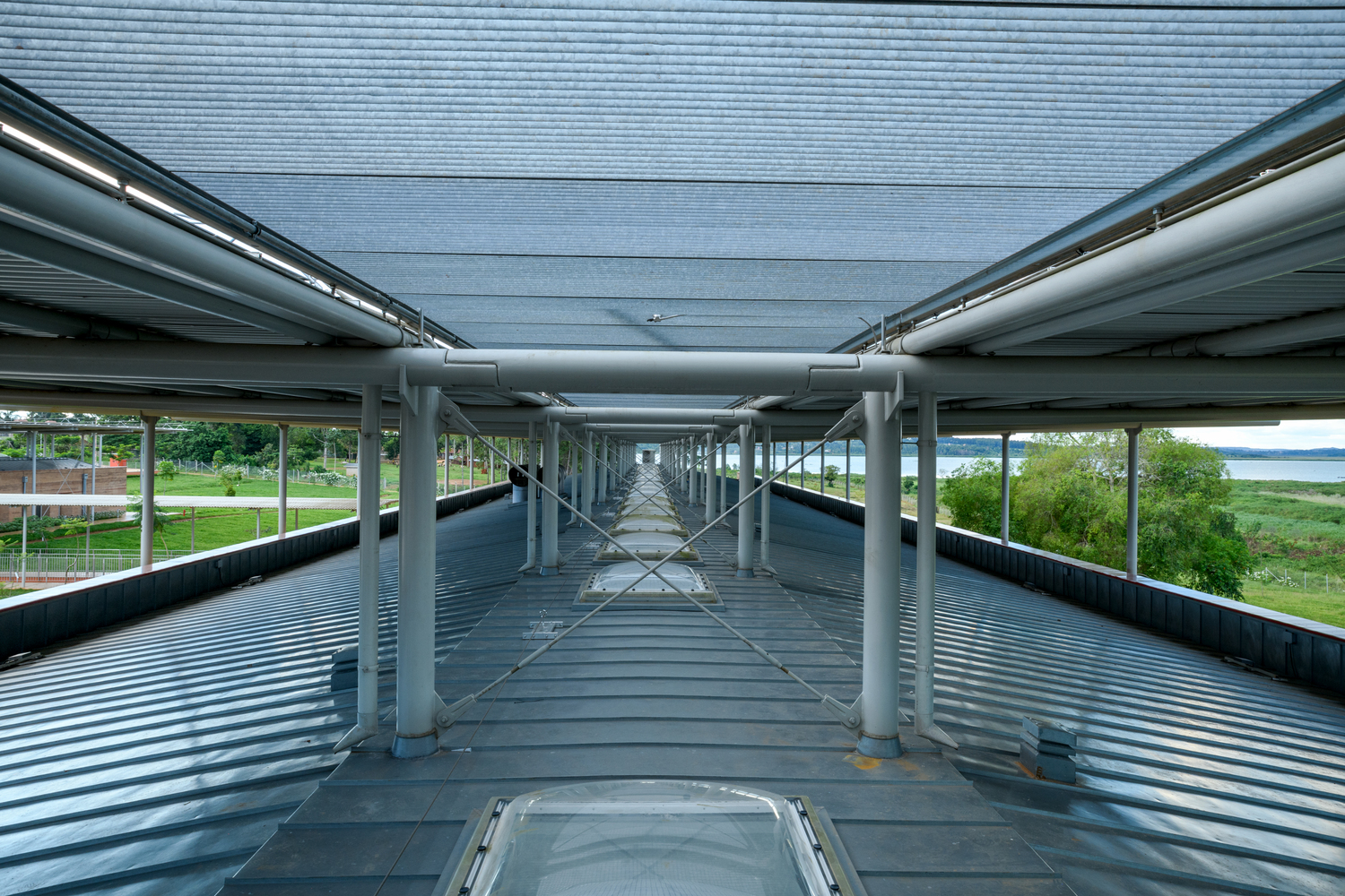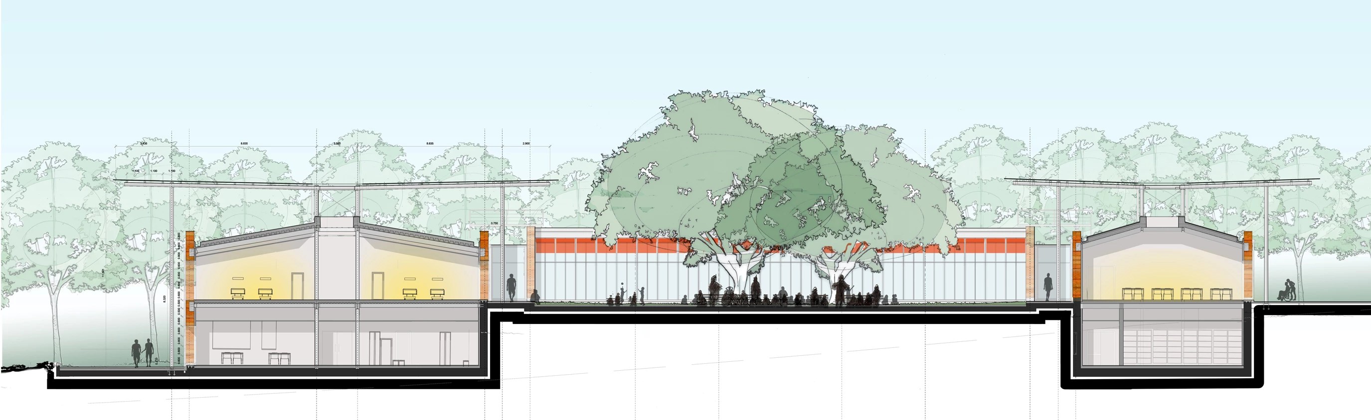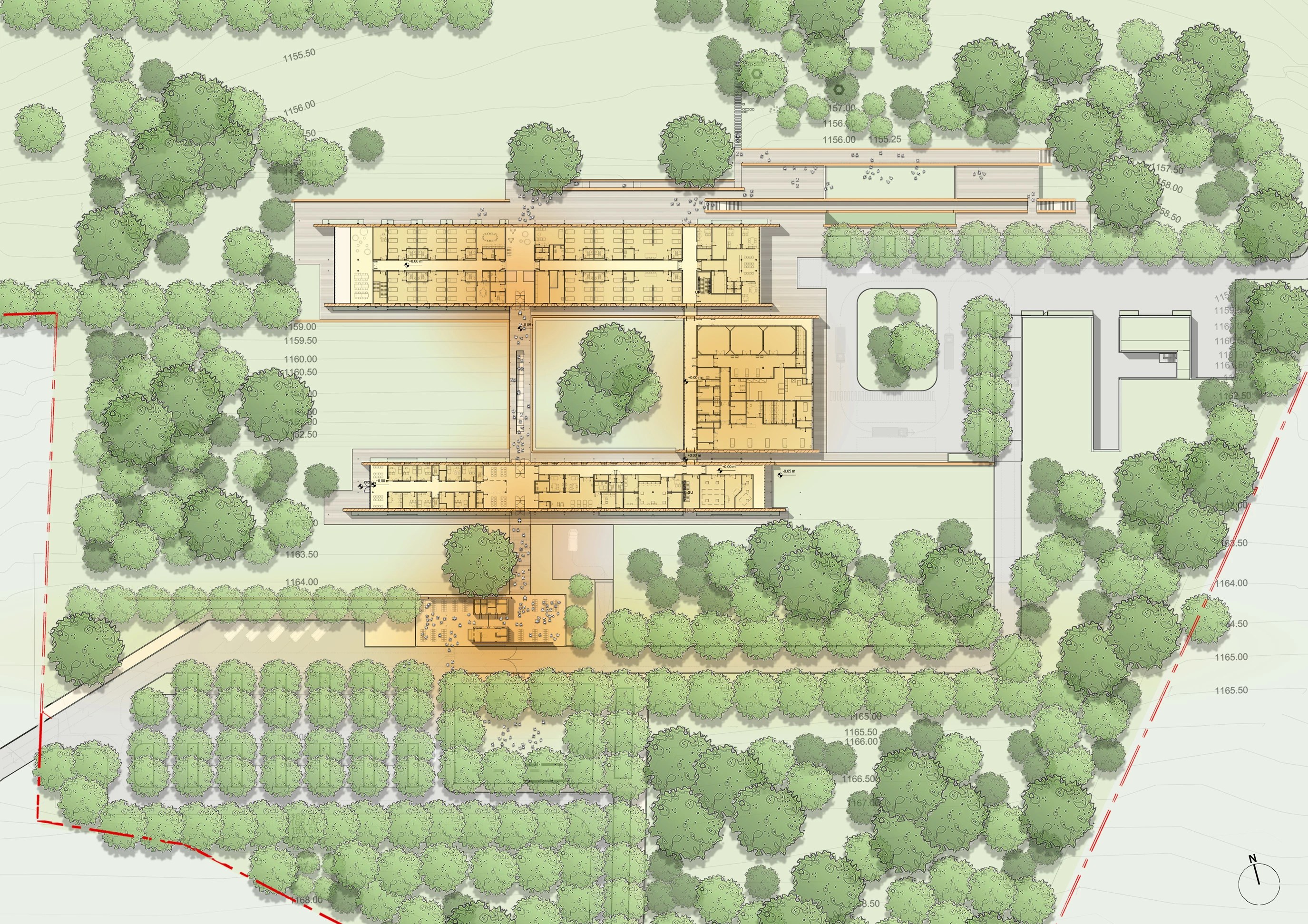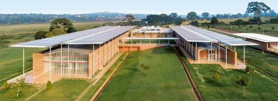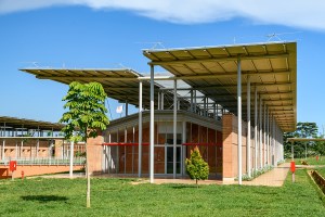 AE Interests: Hospital with three operating theaters, 72 beds, medical laboratories, outpatient clinics, locally sourced materials – rammed earth structure, stacked load-bearing walls, 3,700 meters of photovoltaic panels for solar canopy, responds to topography for access to natural viewing.