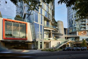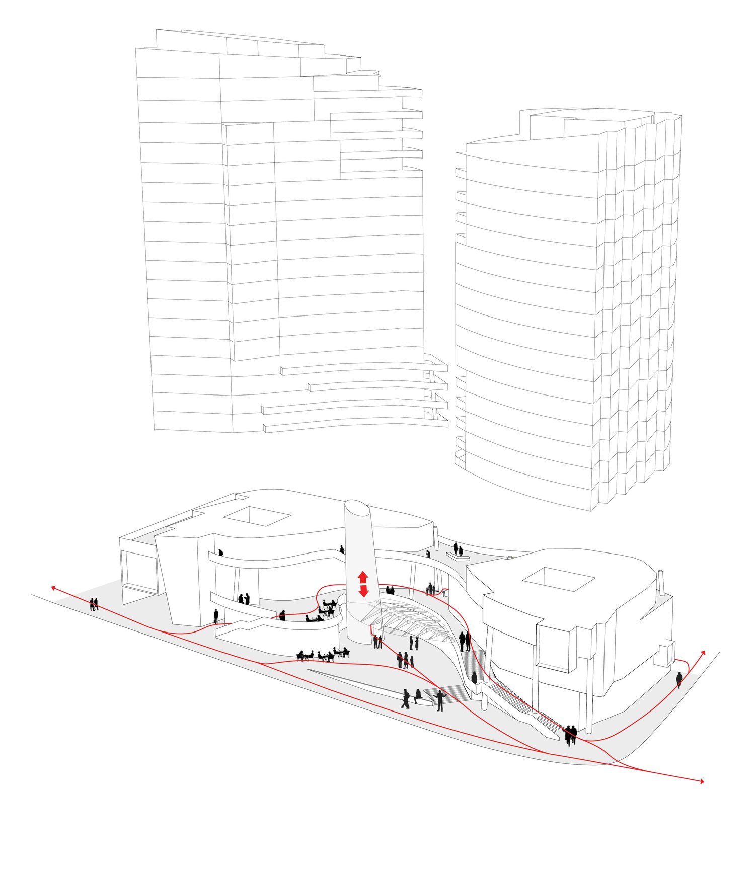 AE Interests: Combination of angular and curvilinear aspects, illuminated plaza via curtain wall glass, canopy of glass, aluminium, & steel